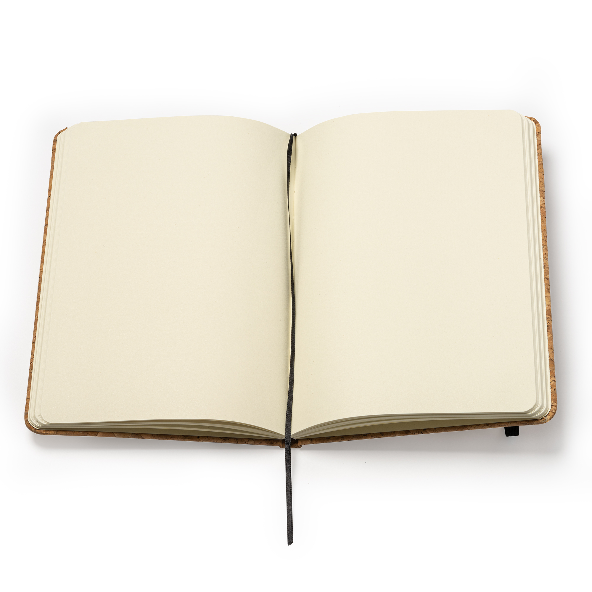 Bloc de notas A5 con tapa rígida de corcho natural. Marcapáginas y banda elástica de cierre. Cuenta con 80 hojas.