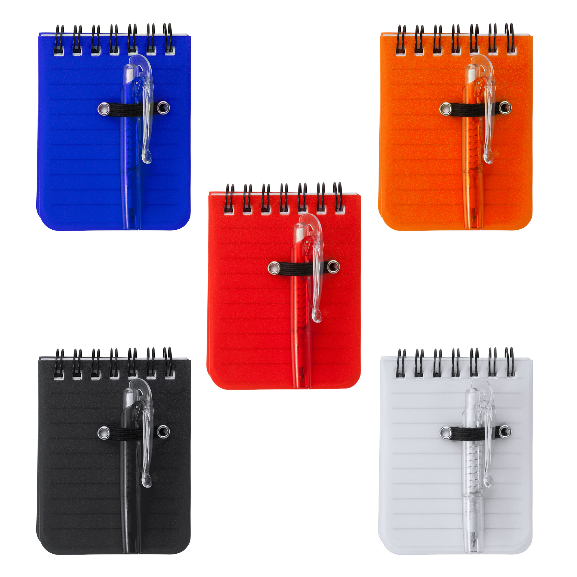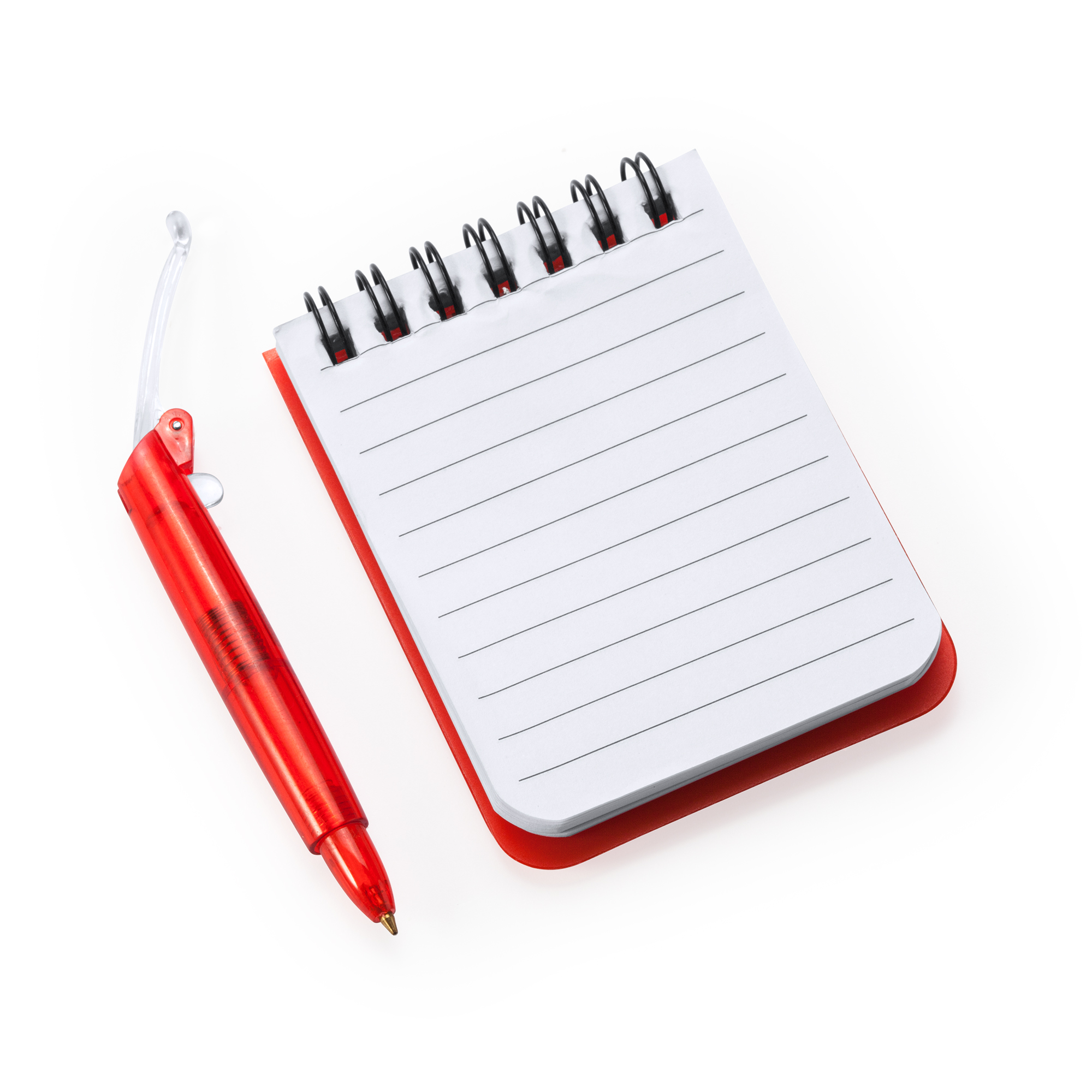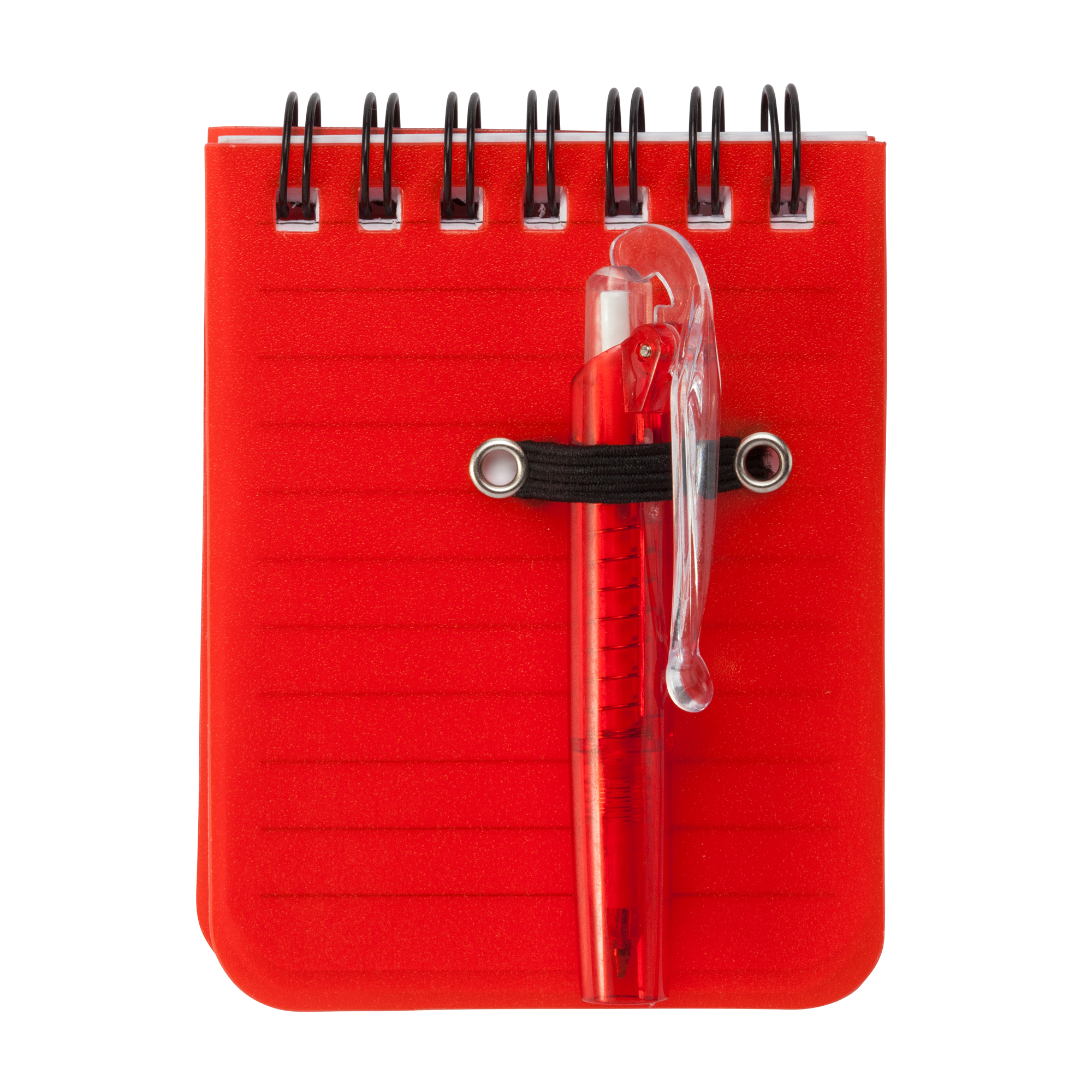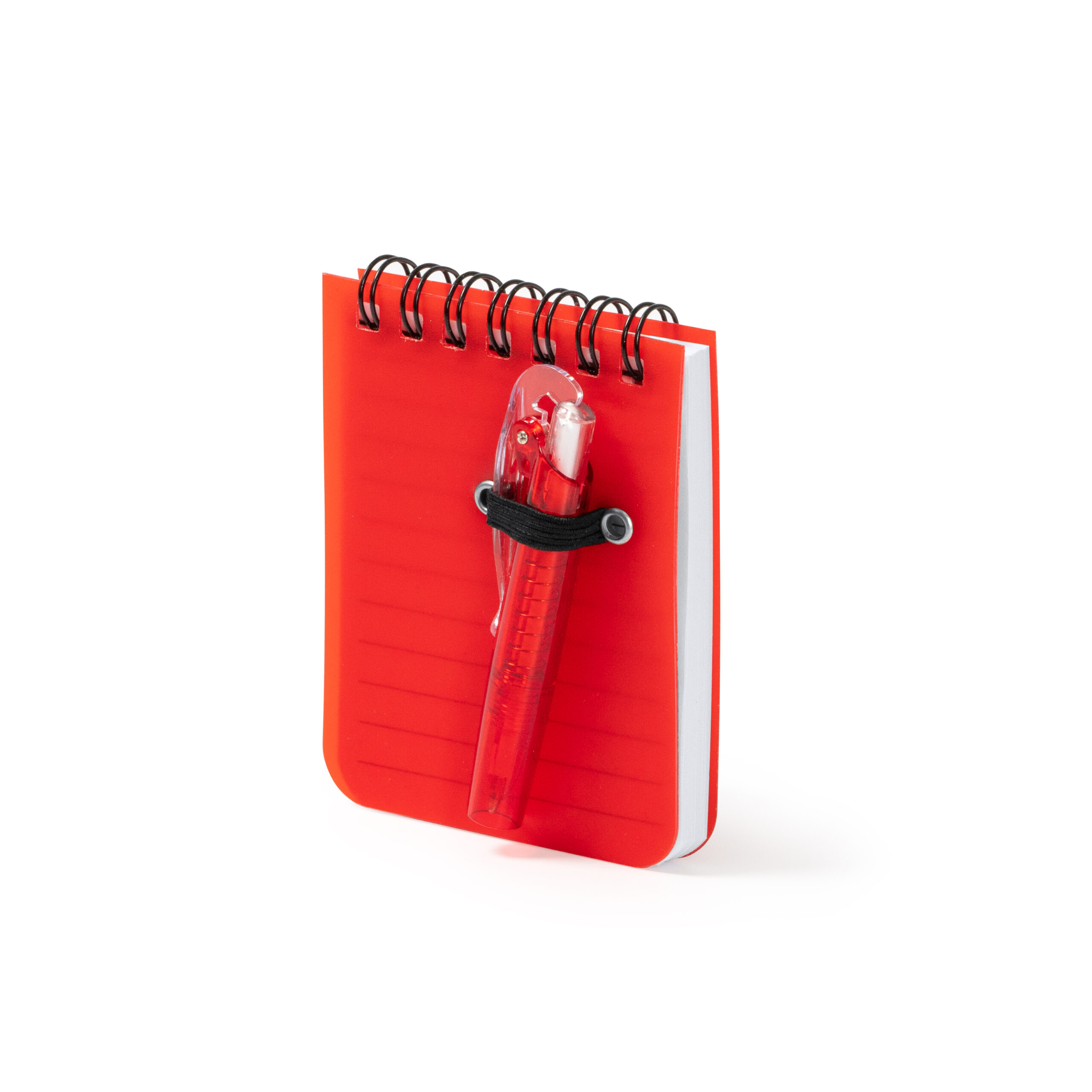 Mini libreta con espiral y tapa rígida de PP. 60 hojas de papel rayado. Incluye bolígrafo con tinta azul.