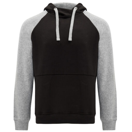 Sudadera bicolor unisex. Capucha con cuello cruzado y ojales metálicos, interior y cordones a contraste. Manga estilo ranglán a contraste. Bolsillo canguro. Puños y bajo con punto canalé con elastano 1×1.