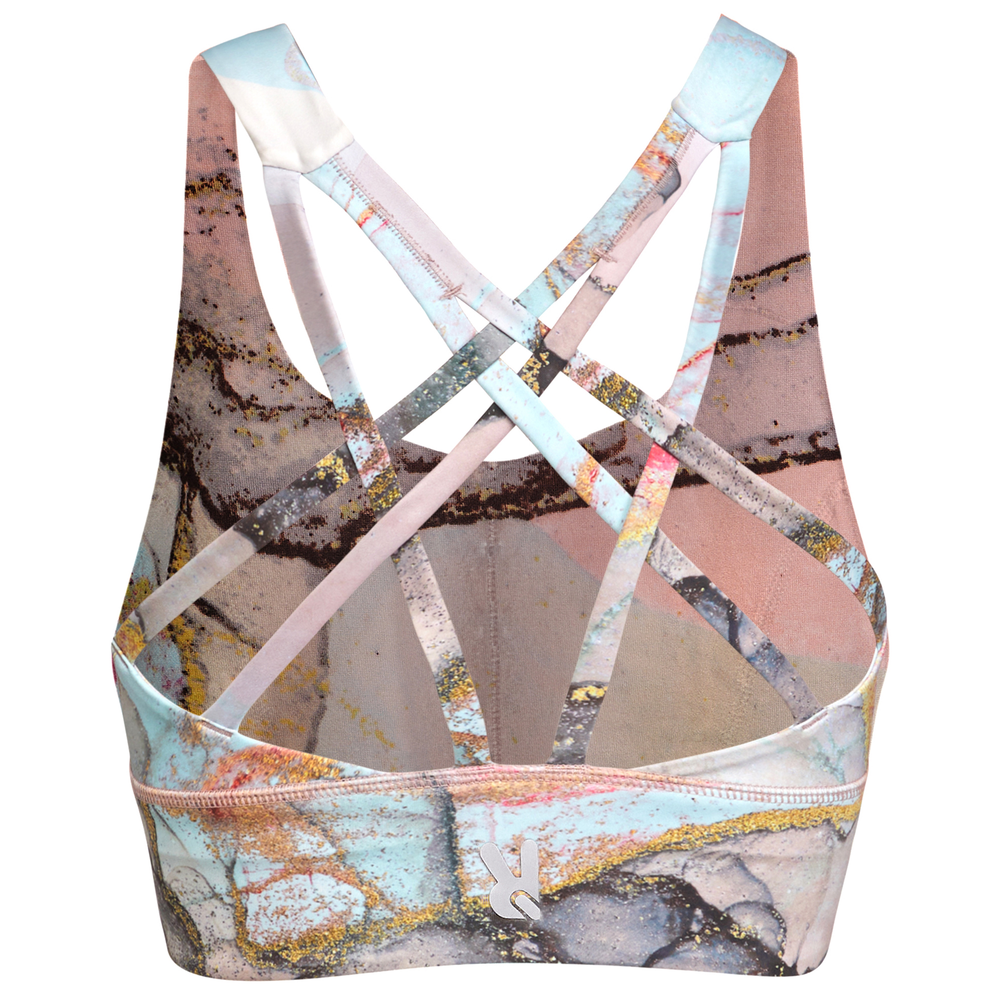 Top deportivo para mujer de alta sujeción. Tirantes entrelazados en espalda. Banda elástica de refuerzo en pieza bajo pecho. Doble tejido y forro. Copas de foam extraíbles. Logo Roly reflectante en la espalda.