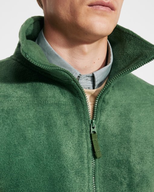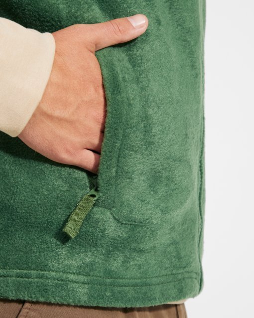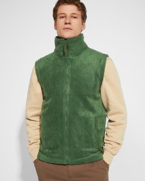 Chaleco polar con cuello alto. Cremalleras inyectadas a tono. Bolsillos laterales con tapeta.