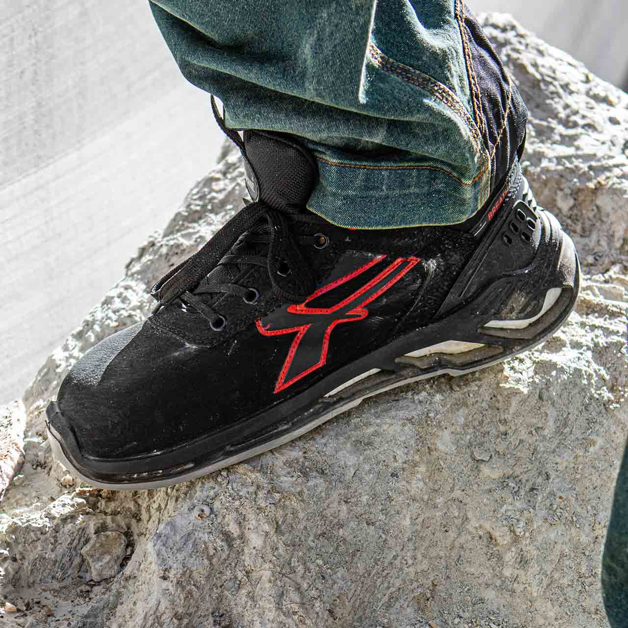 Zapatos de seguridad bajos, ligeros y cómodos U-Power de la línea Red 360, con parte superior en piel nobuck natural tratado hidrorepelente, collarín con tejido de fibra Lycra® y escudo anti-impactos en el talón, puntera de aluminio, antiarrugas, antideslizante y suela de poliuretano PU / PU, S3 SRC CI ESD