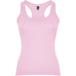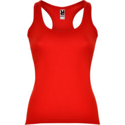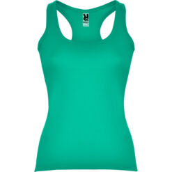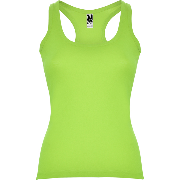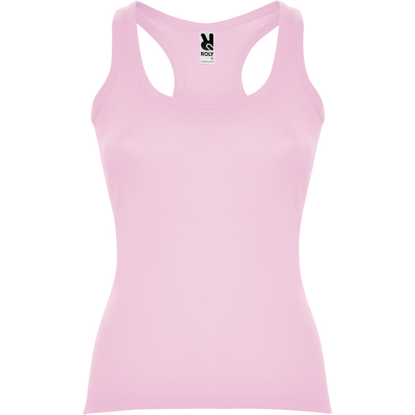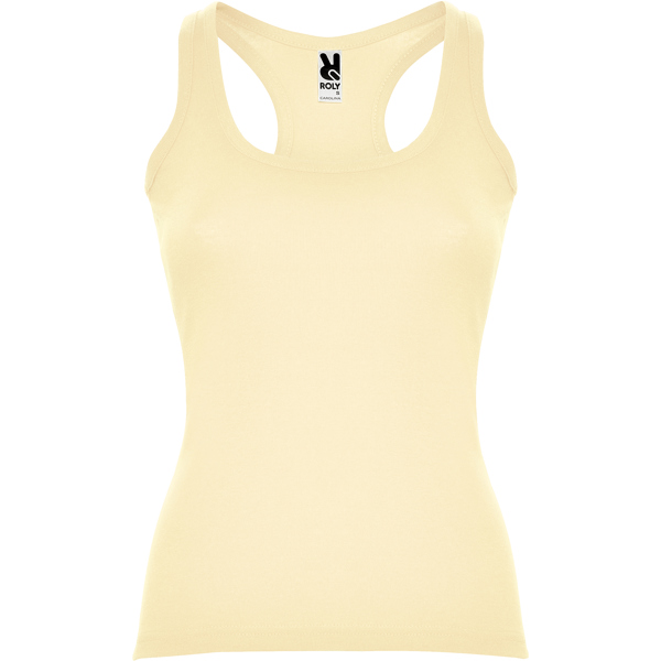 Camiseta entallada, con sisas y escote ribeteado, ancho y enrollado. Espalda estilo nadadora y costuras laterales.