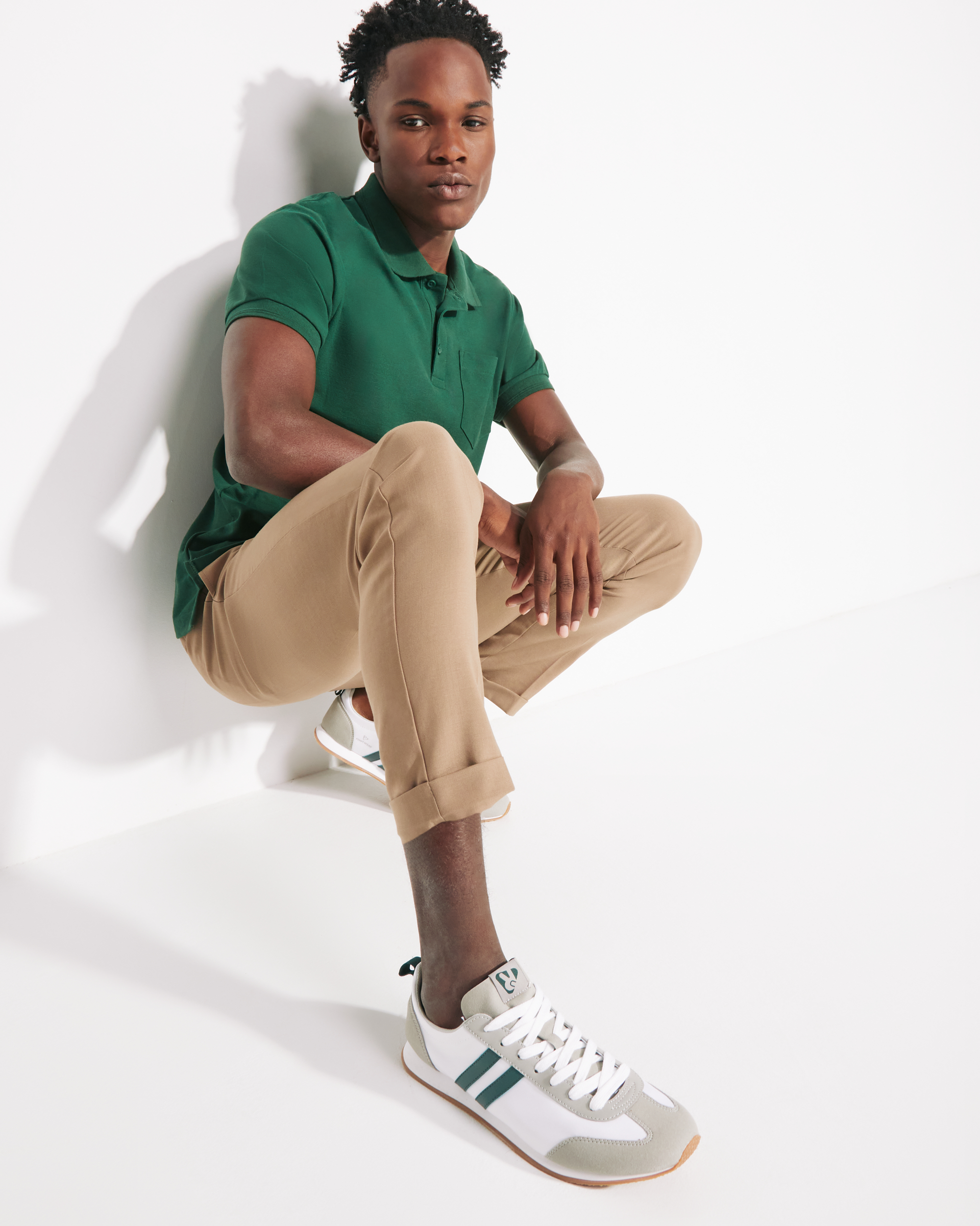 Polo de manga corta con bolsillo en pecho izquierdo. Cuello y ribete de manga en canalé 1×1 con detalle en relieve. Tapeta con 3 botones. Cubrecosturas reforzado en cuello.