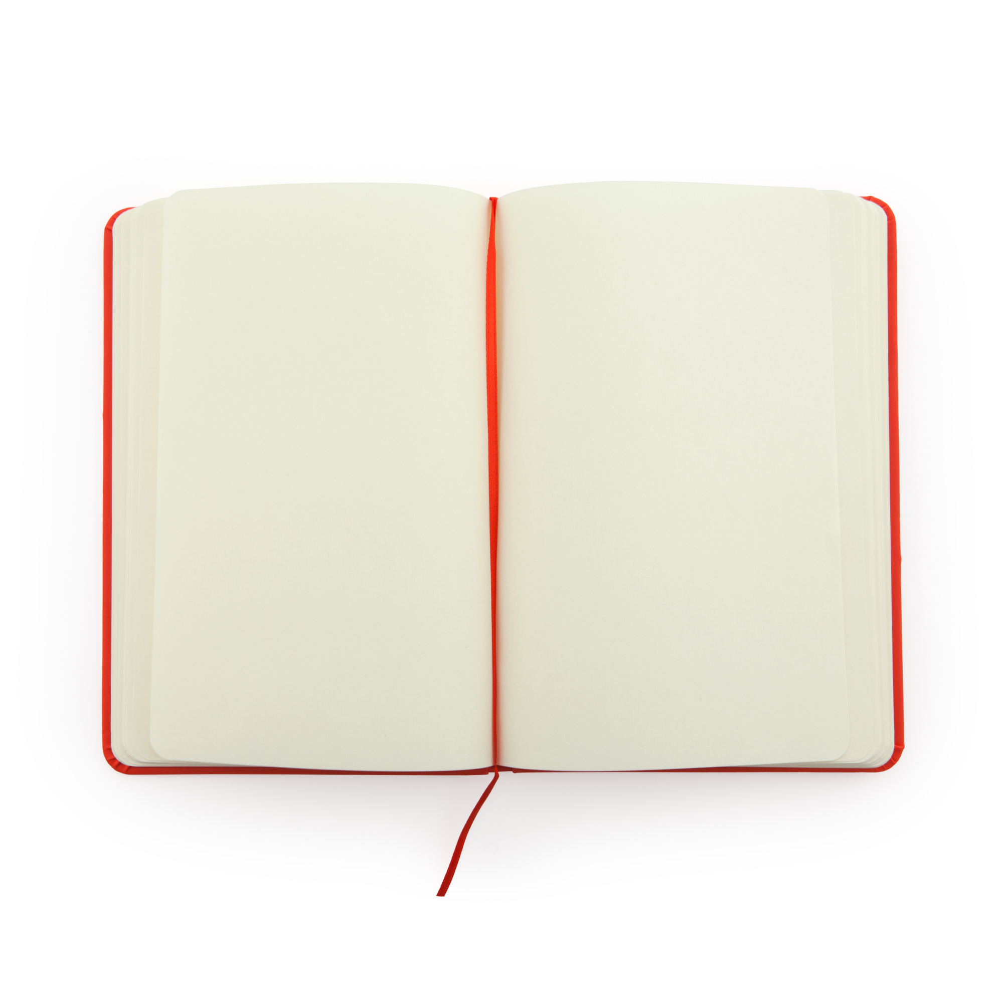 Bloc de notas A6 con tapa rígida de polipiel. Marcapáginas y banda elástica. 100 hojas.