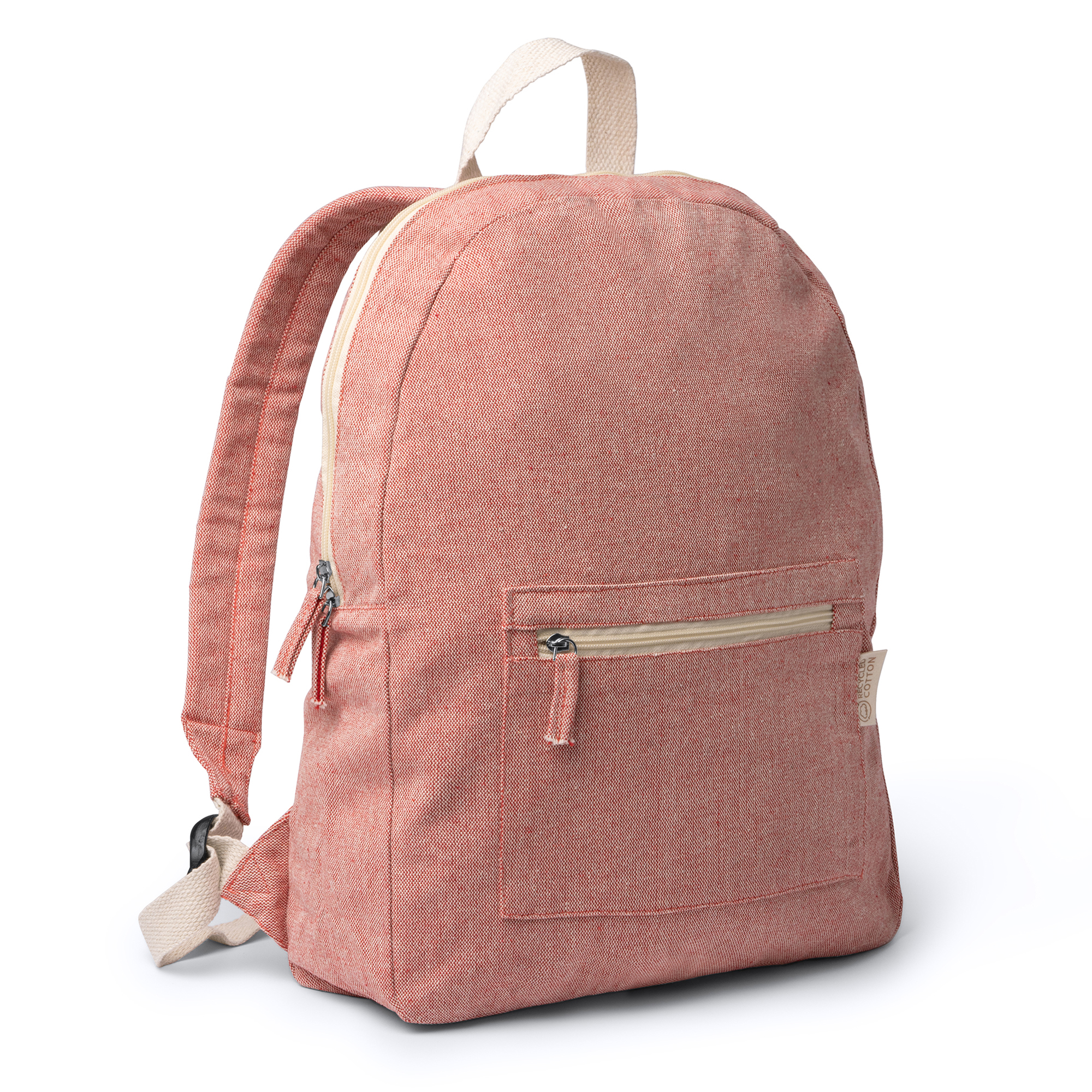 Mochila ecológica realizada en algodón reciclado de 320 g/m² en acabado jaspeado. Bolsillo frontal y asas acolchadas.