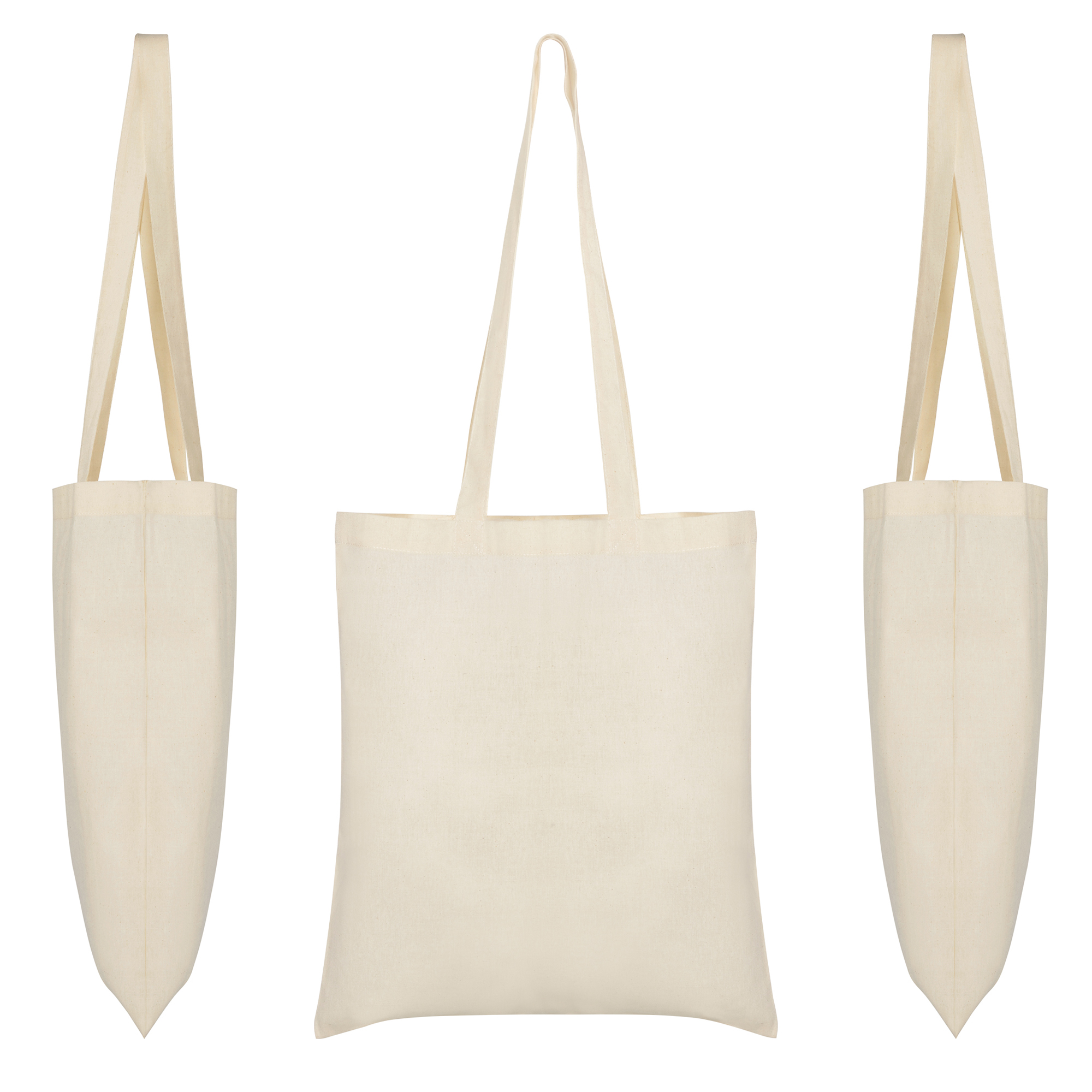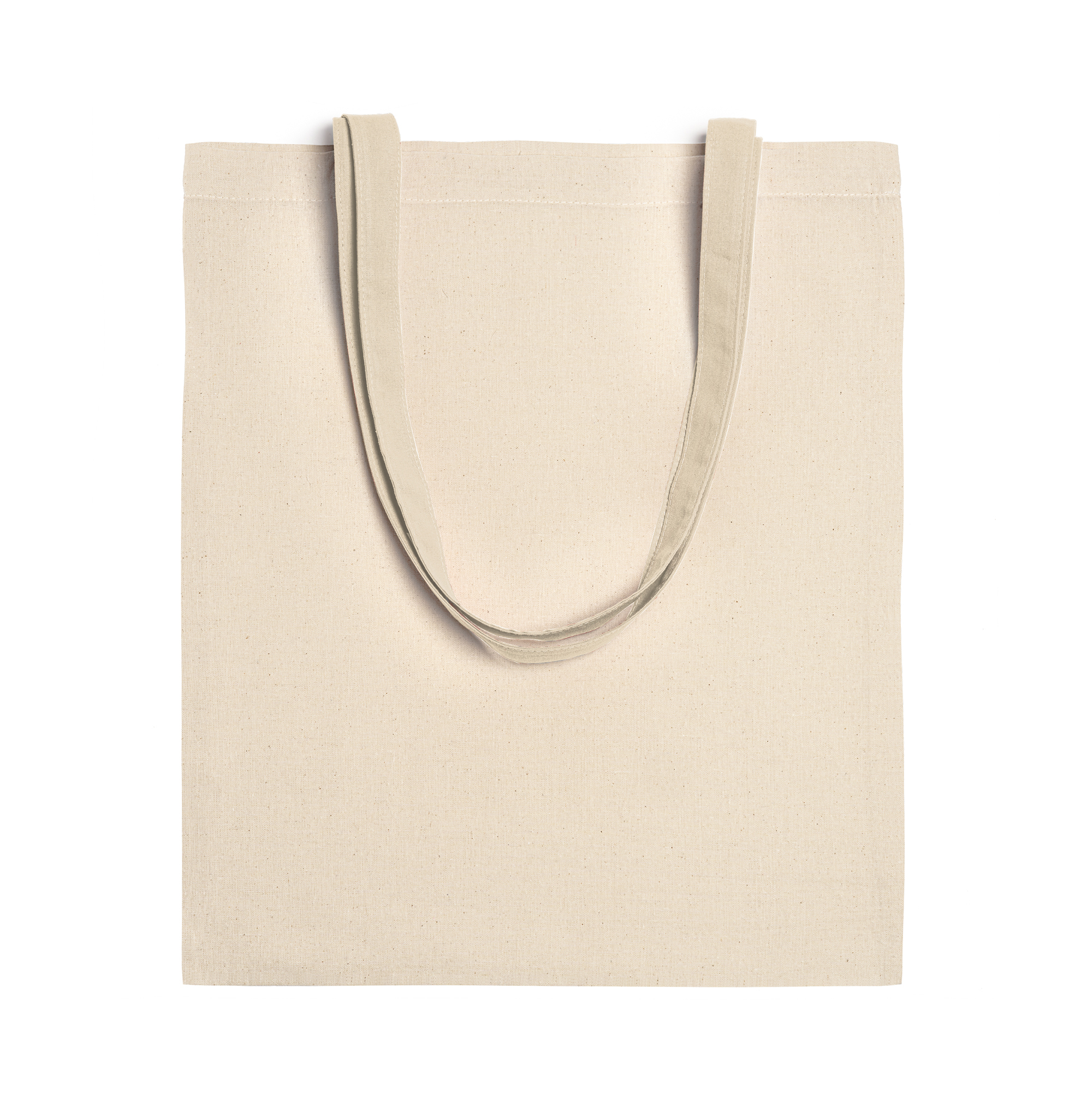 Bolsa fabricada en tejido de algodón en color natural, con asa larga de cinta en el mismo color.