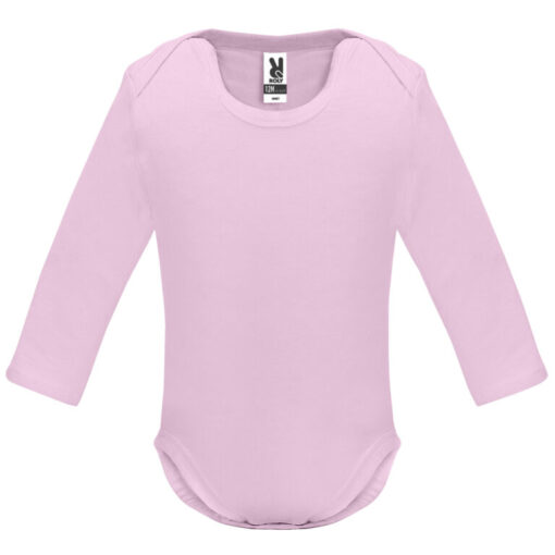 Body de bebé de manga larga de punto liso. Cuello redondo y bajo ribeteado en canalé 1×1. Cierre con botones a presión en la entrepierna. Hombro de apertura cruzada.