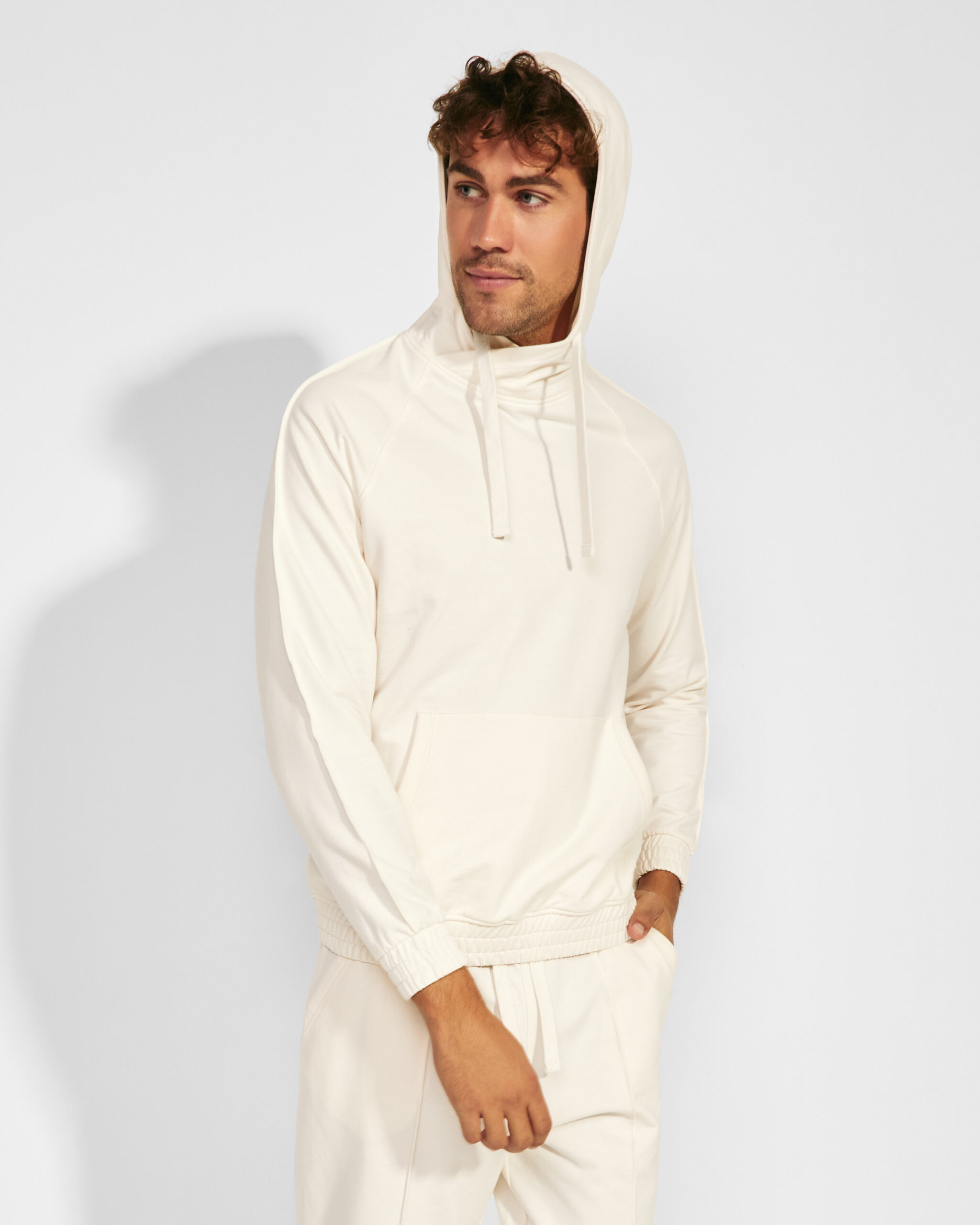 Sudadera con capucha unisex. Bolsillo canguro. Cordones planos con ojales bordados. Puños y cintura en tejido principal. Detalle de costura con relieve en mangas.