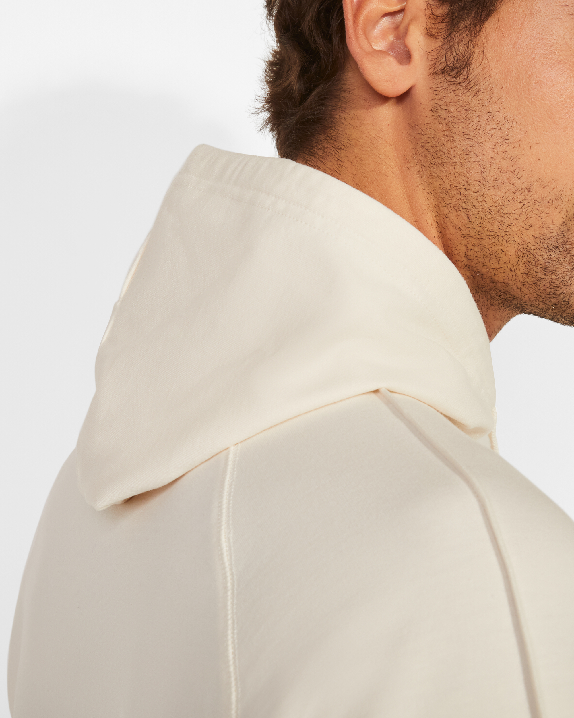 Sudadera con capucha unisex. Bolsillo canguro. Cordones planos con ojales bordados. Puños y cintura en tejido principal. Detalle de costura con relieve en mangas.