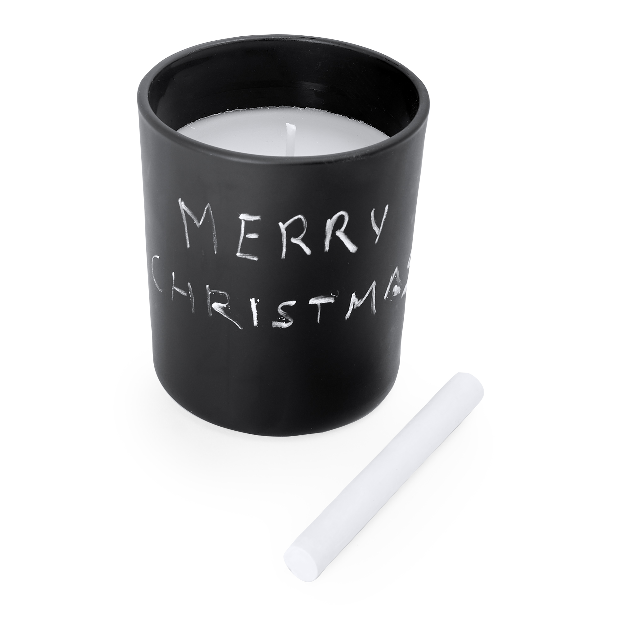 Vela aromática con olor a vainilla en recipiente cerámico negro redondo. Incluye una tiza para escribir sobre el recipiente. Vela y mecha blancas. Fragancia de vainilla.