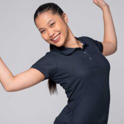 Polo piqué deportivo de manga corta para mujer, ligeramente entallado, con tapeta de tres botones, tapacosturas y aberturas laterales en contraste. Disponible en 7 colores y desde la talla S hasta la 3XL. Etiqueta removible.