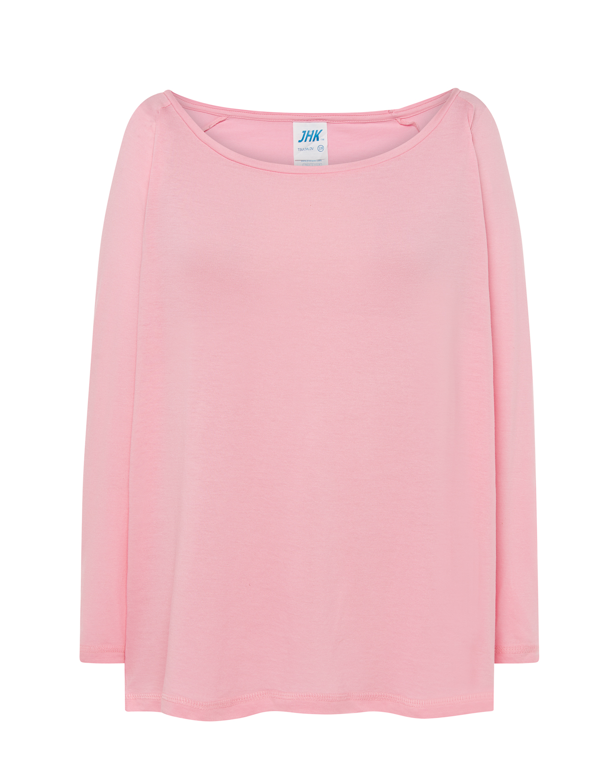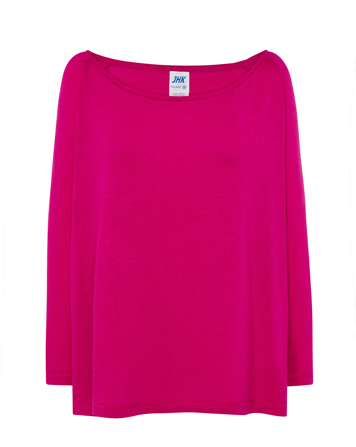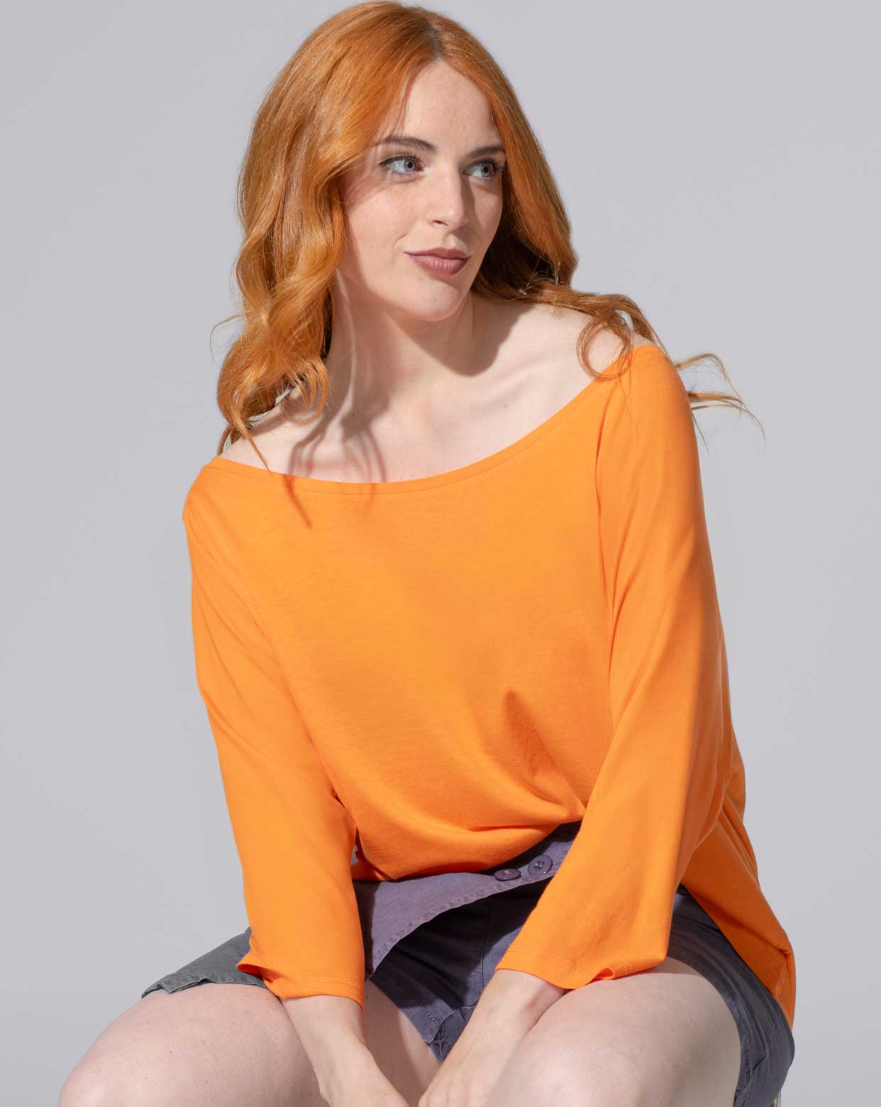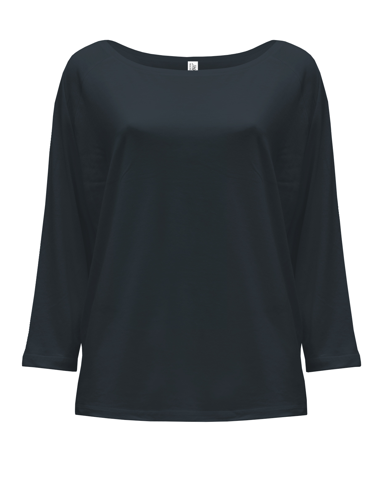 Camiseta de mujer en punto liso con manga raglan 3/4 y cuello redondo amplio. Etiqueta removible. Disponible en 11 colores.