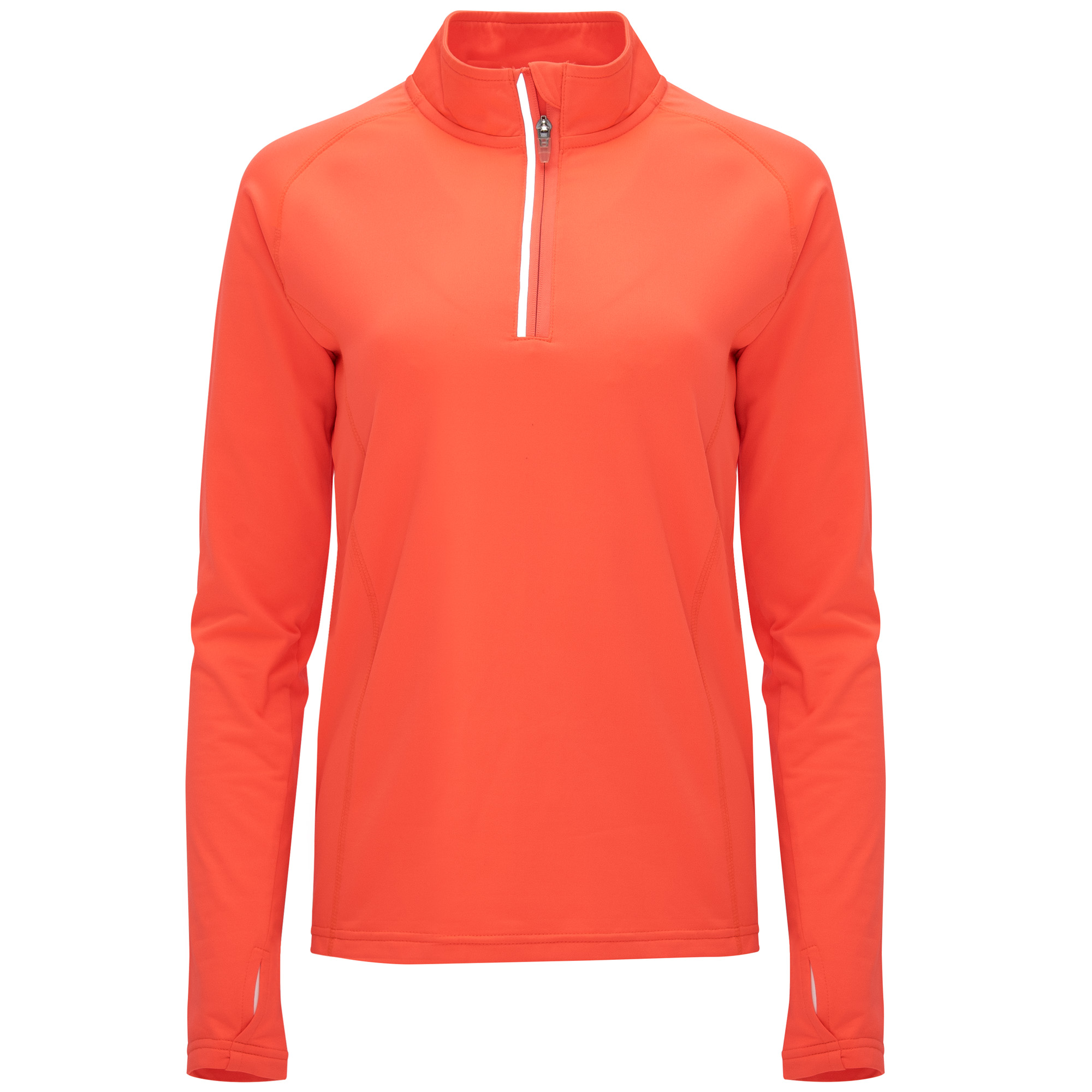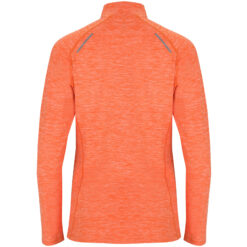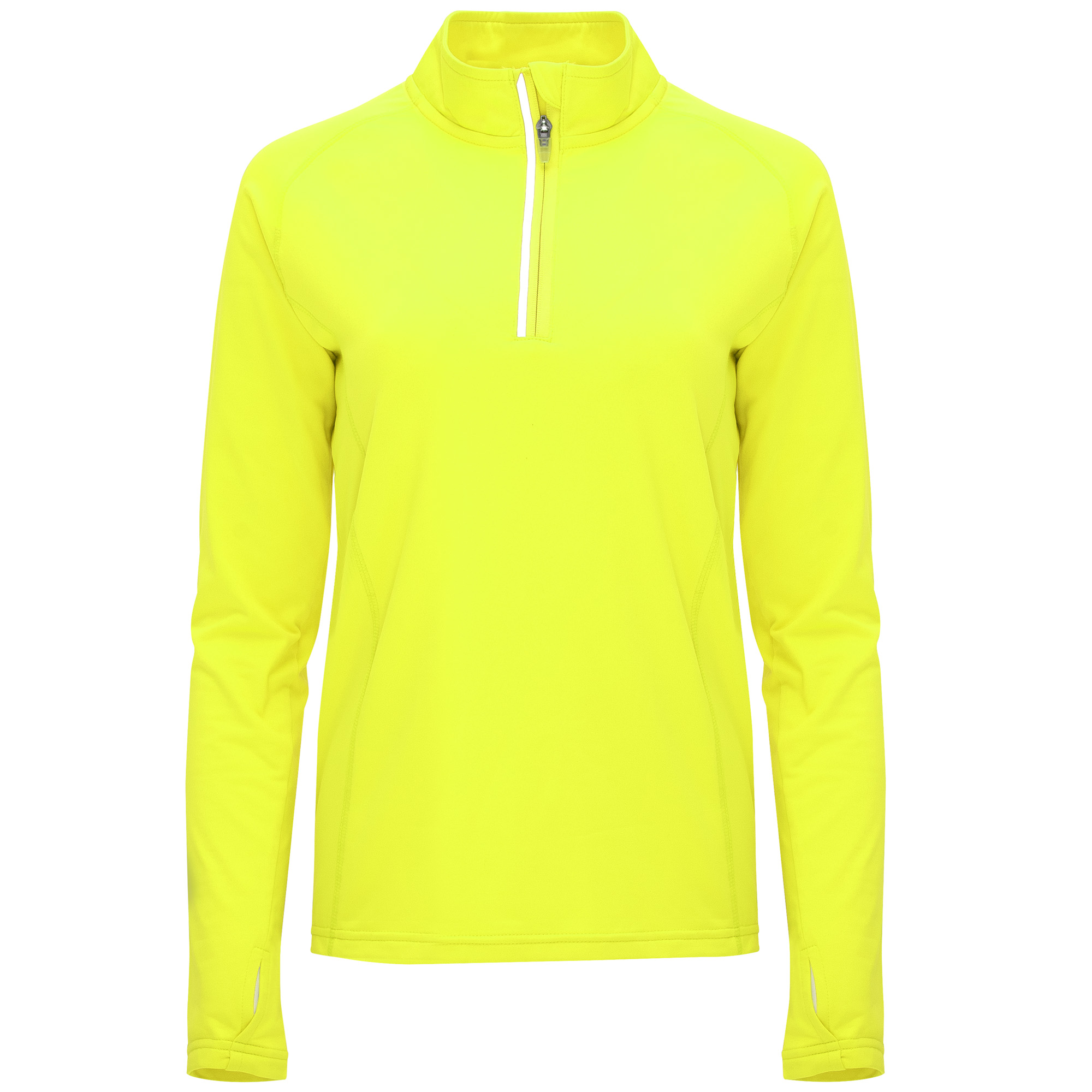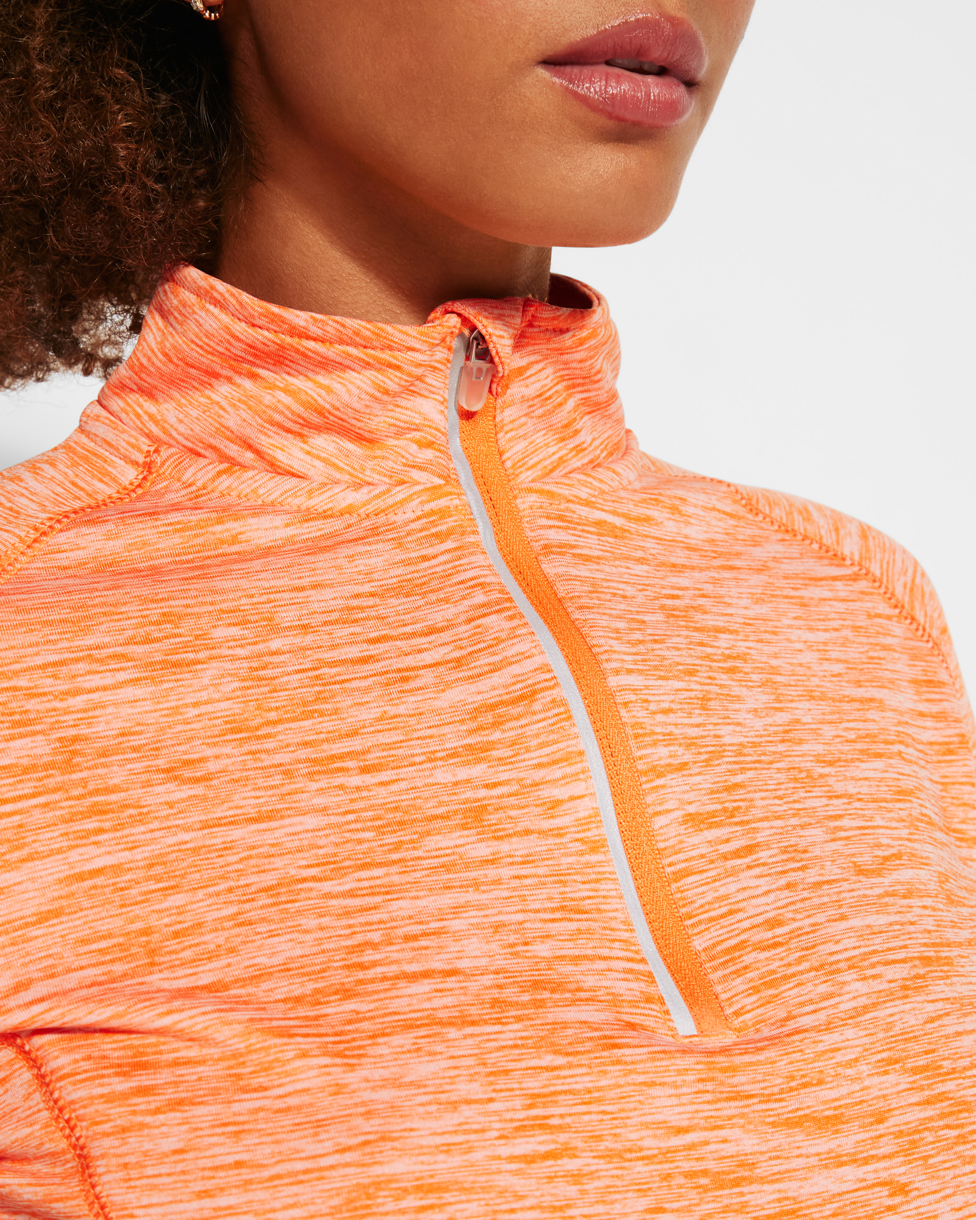 Sudadera técnica de manga larga ranglán para mujer con interior perchado. Cubrecosturas de refuerzo a contraste en el interior del cuello. Media cremallera invertida a tono con detalle reflectante. Puños con apertura para pulgar. El patronaje de la espalda es ligeramente más largo que el delantero. Detalles reflectantes en las espalda.