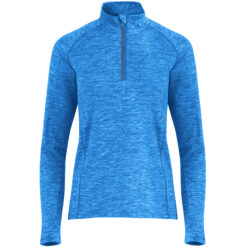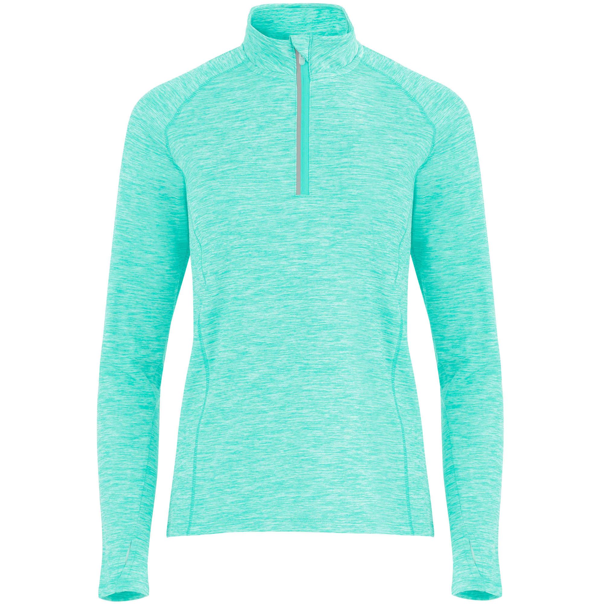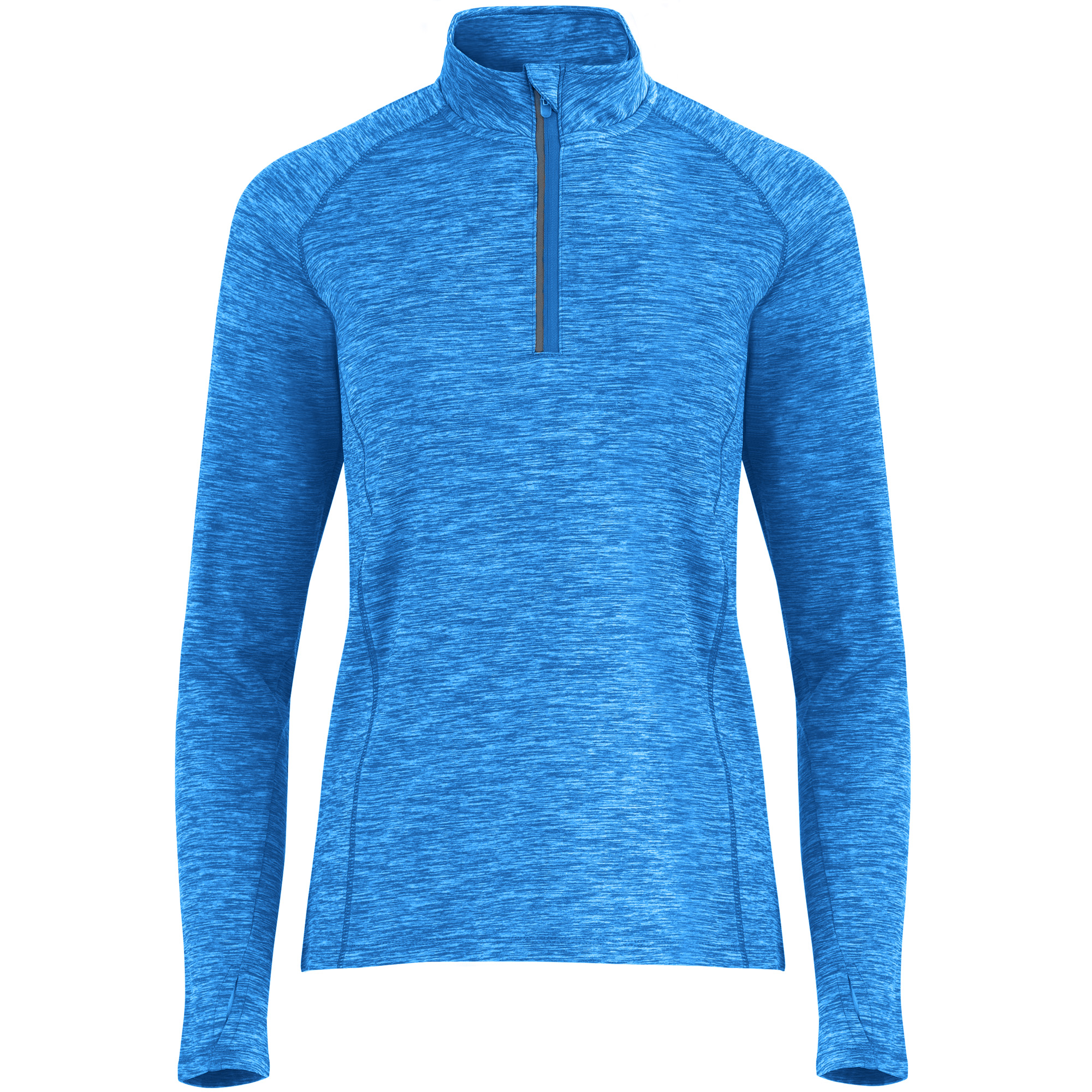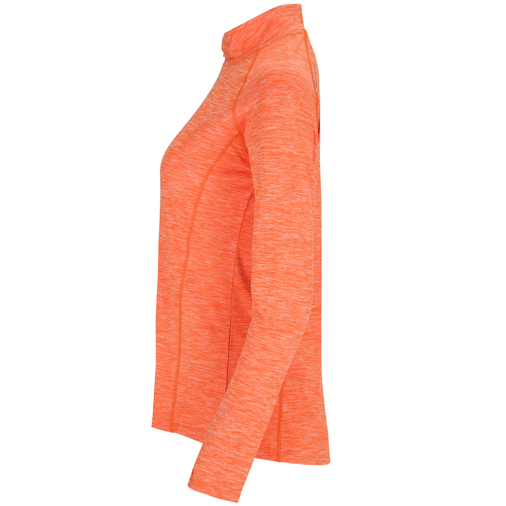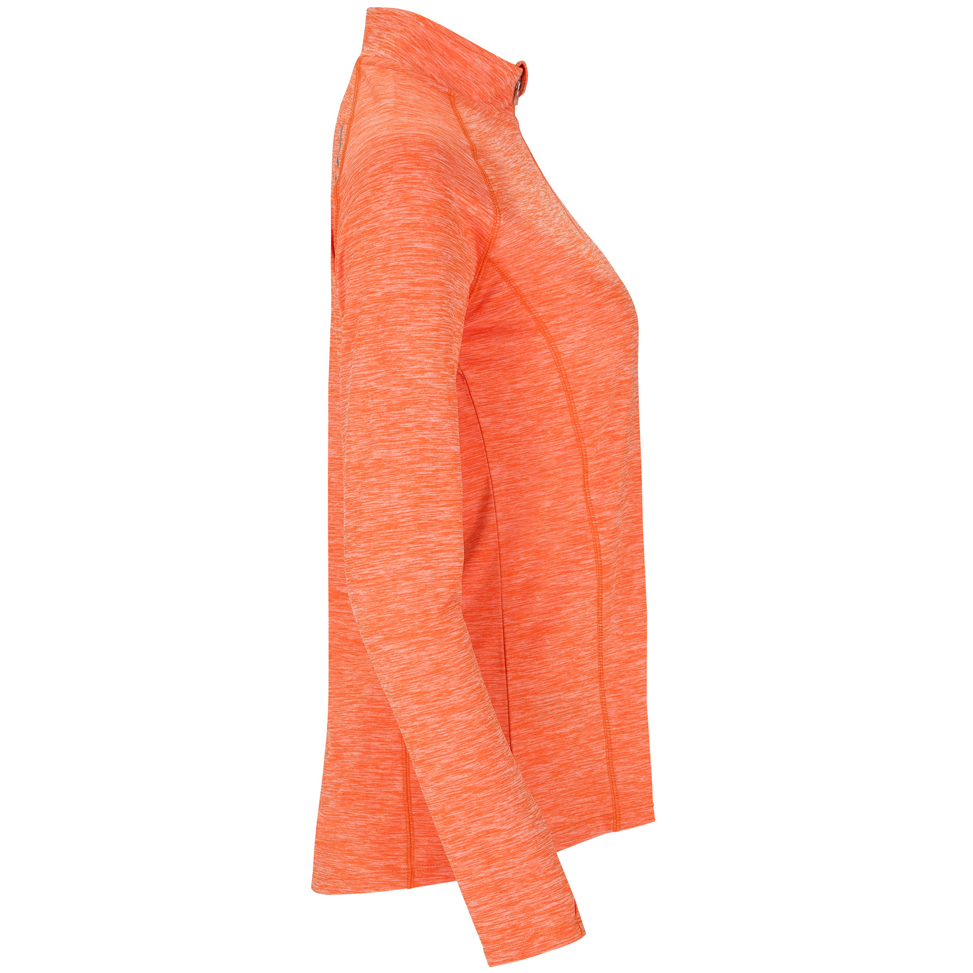 Sudadera técnica de manga larga ranglán para mujer con interior perchado. Cubrecosturas de refuerzo a contraste en el interior del cuello. Media cremallera invertida a tono con detalle reflectante. Puños con apertura para pulgar. El patronaje de la espalda es ligeramente más largo que el delantero. Detalles reflectantes en las espalda.