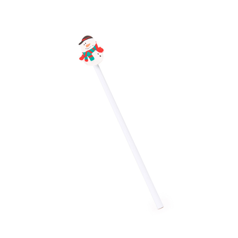Lápiz de madera blanco y redondo con goma disponible en tres diseños navideños: árbol, Papá Noel y muñeco de nieve.