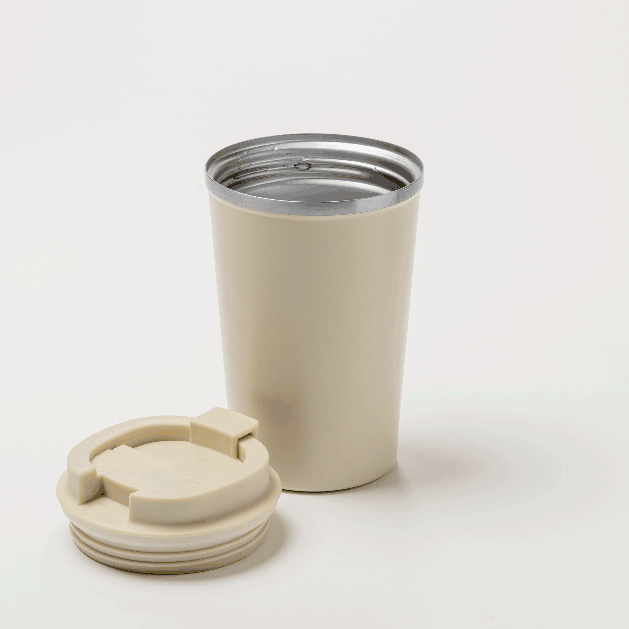 Vaso térmico de acero inoxidable 304 de doble pared. Tapa con rosca antifugas y práctico tapón para beber. Capacidad de 450 ml.