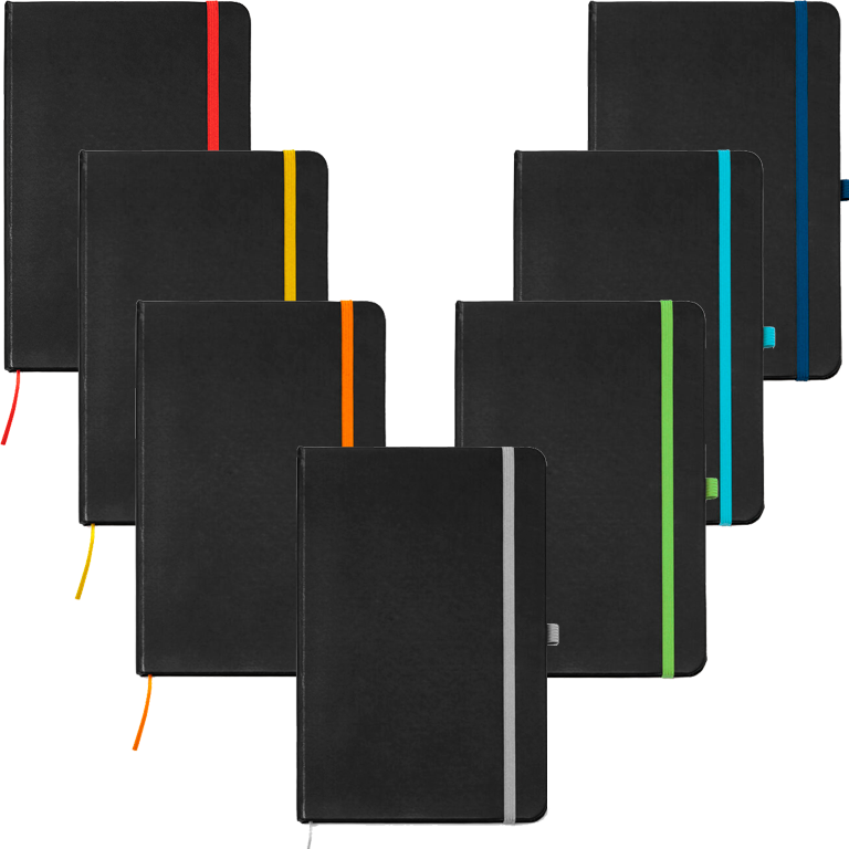 Bloc de notas A5 con tapa rígida de PU negro. Marcapáginas, banda elástica de cierre y soporte para bolígrafo a color. Cuenta con 80 hojas rayadas.