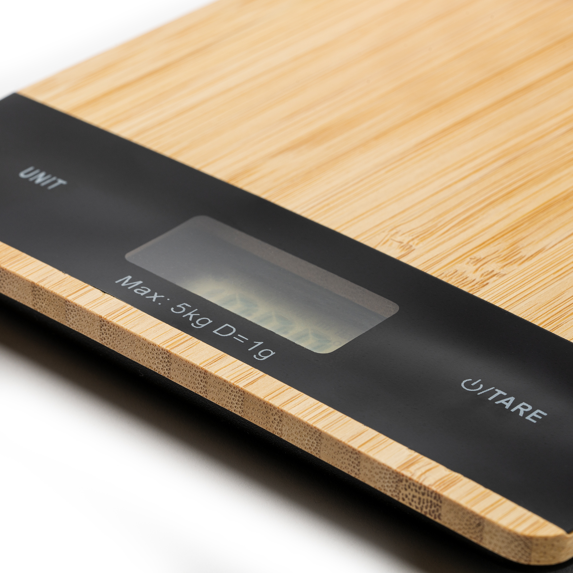 Báscula de cocina digital con carcasa frontal de bambú. Ideal para pesar los ingredientes y los alimentos cuando cocines tus mejores recetas. Con una capacidad máxima de 5 kg. Funciona con una pila incluida.