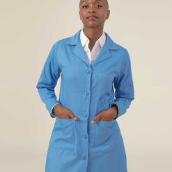 Bata de mujer. Cuello en V.Bolsillo en el pecho en el lado izquierdo y dos bolsillos delanteros en la parte inferior.Cinco botones frontales a tono. Cinturón en espalda. Silueta entallada….