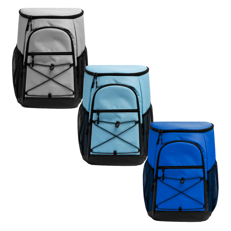 Mochila nevera de poliéster 210D Ripstop. Bolsillo principal y frontal con interior isotérmico. Compartimento de cuerda elástica frontal y bolsillos laterales de rejilla.