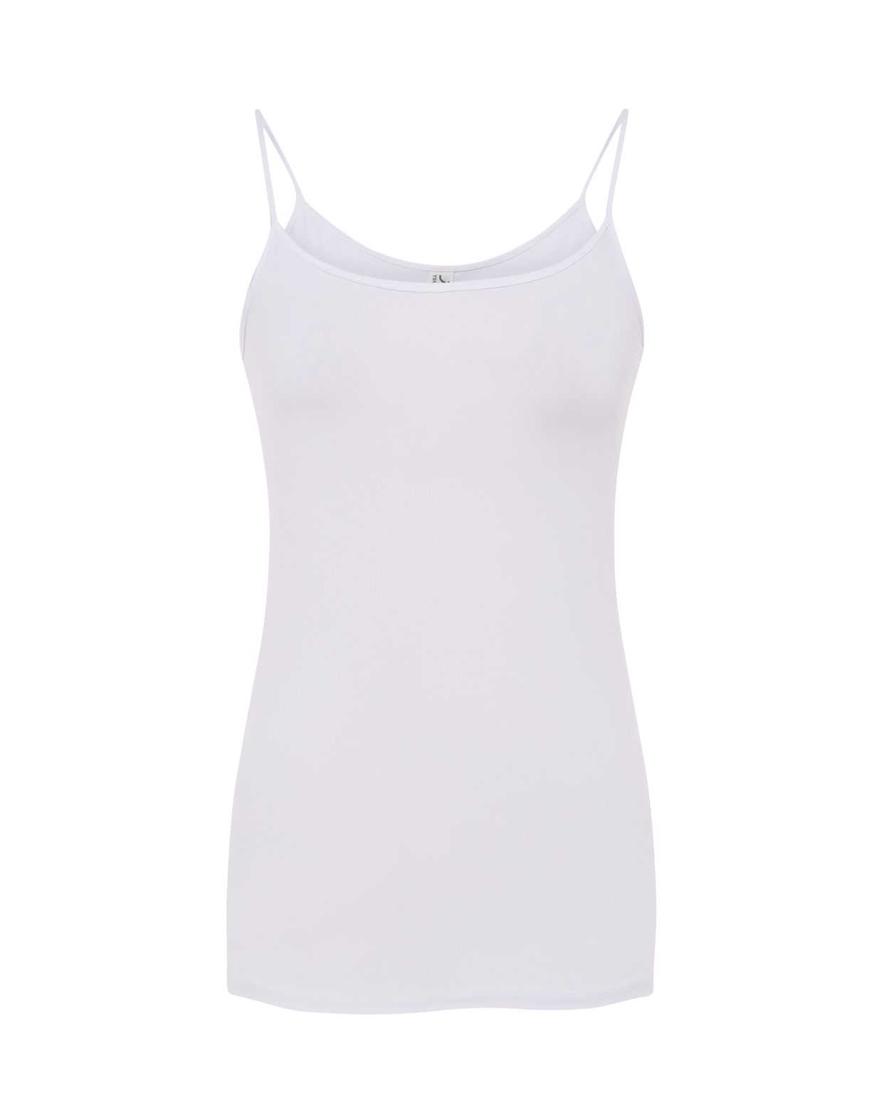 Camiseta básica de lycra con tirantes para mujer. Disponible en blanco y negro y desde la talla S hasta la XL. Etiqueta removible.