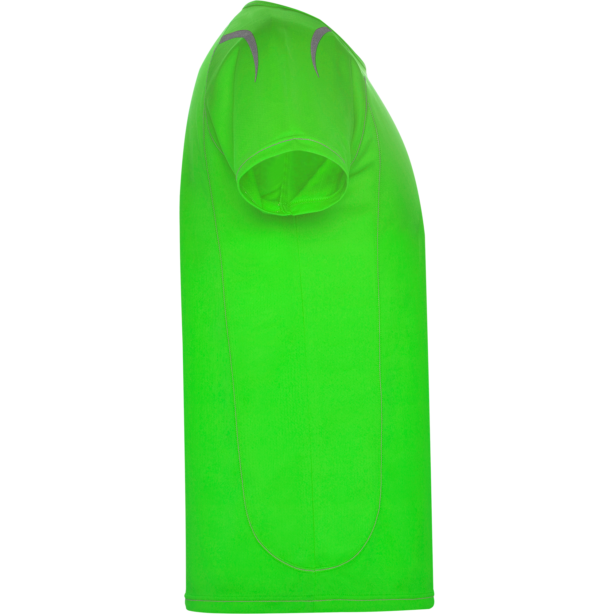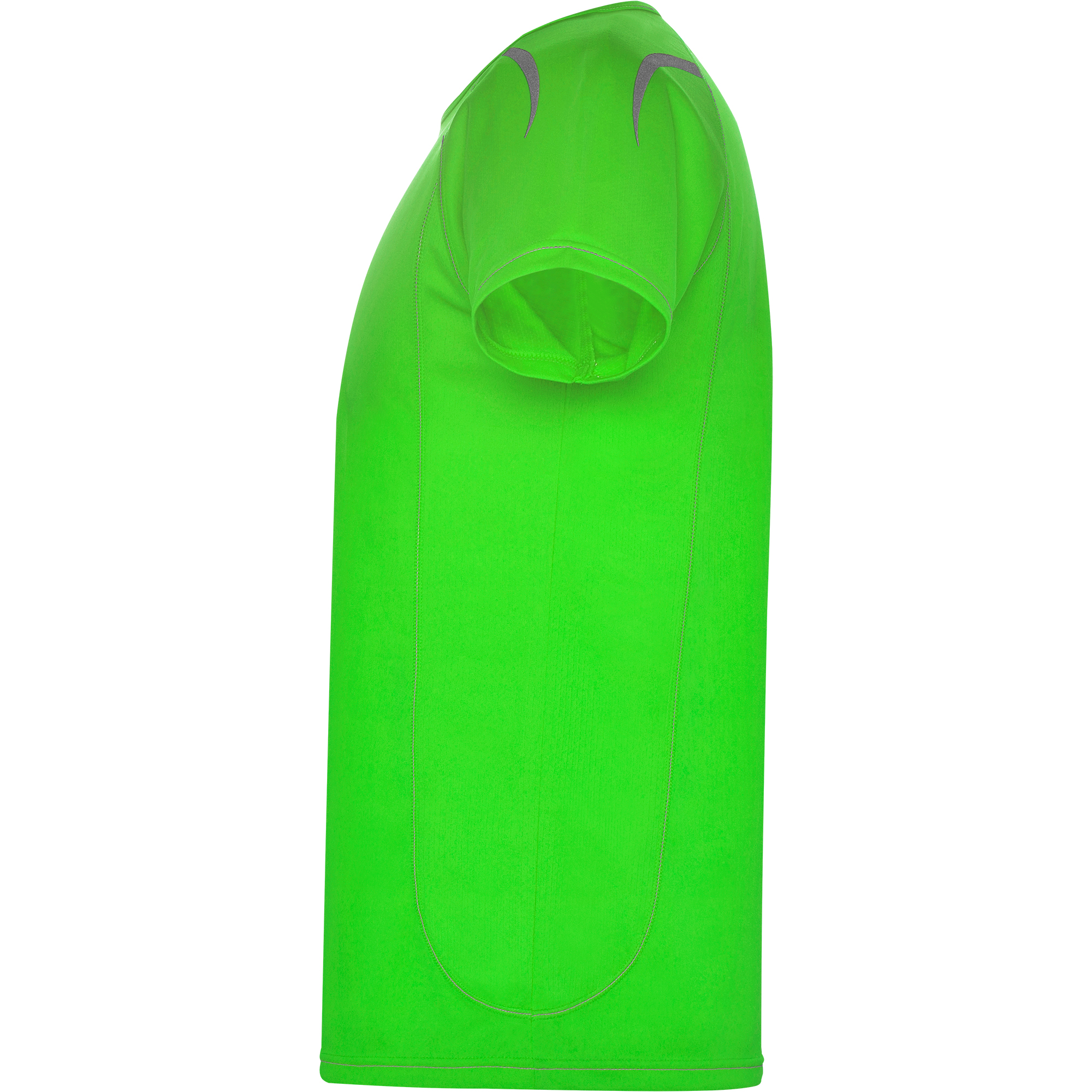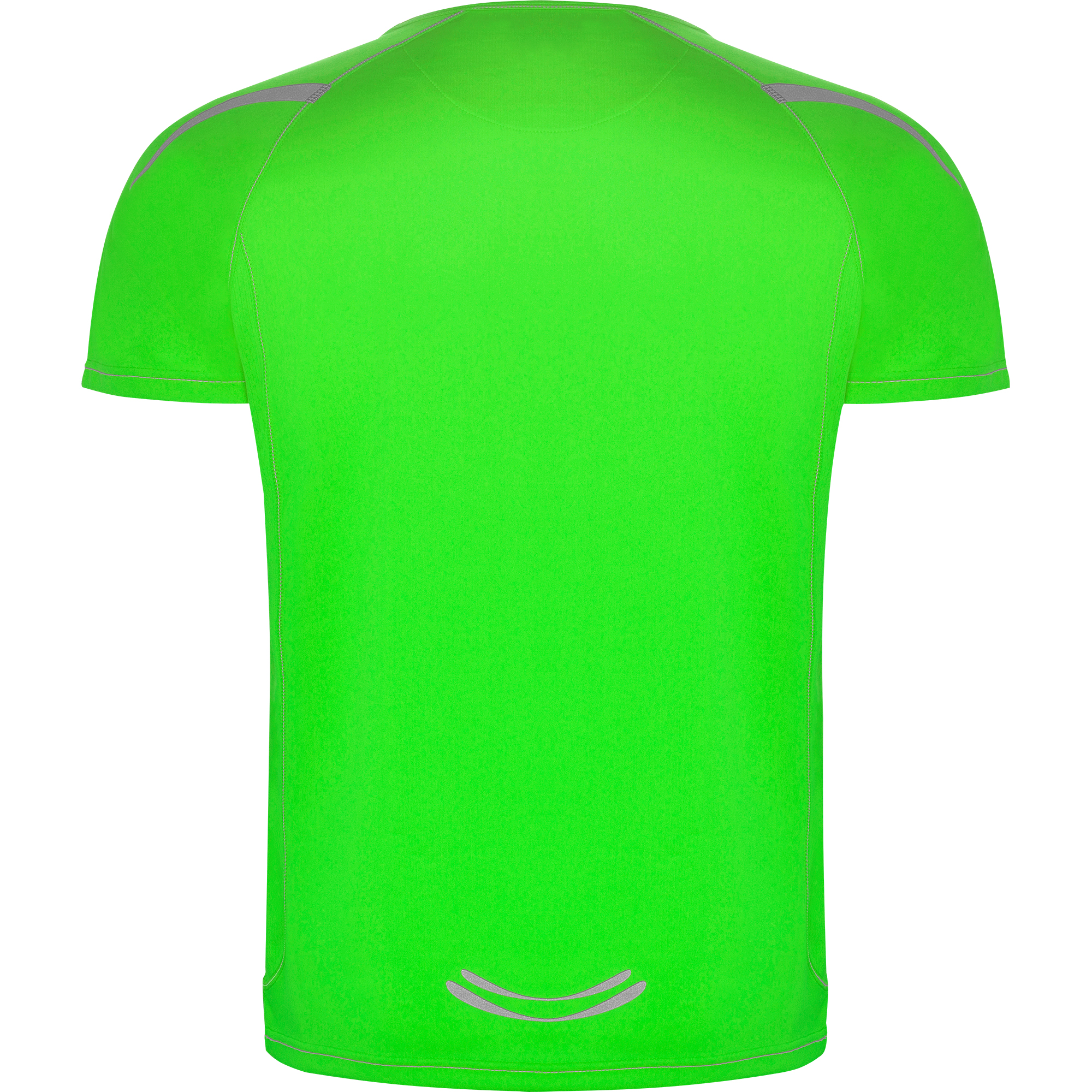 Camiseta técnica en tejido punto liso, de manga corta ranglán, con costuras en contraste en bocamangas, bajo, cuello y laterales. Cuello viveado con el mismo tejido. Tejido transpirable de fácil lavado y secado. Detalles reflectantes, excepto en colores negro y royal, que el detalle es en contraste en color amarillo, no reflectante.