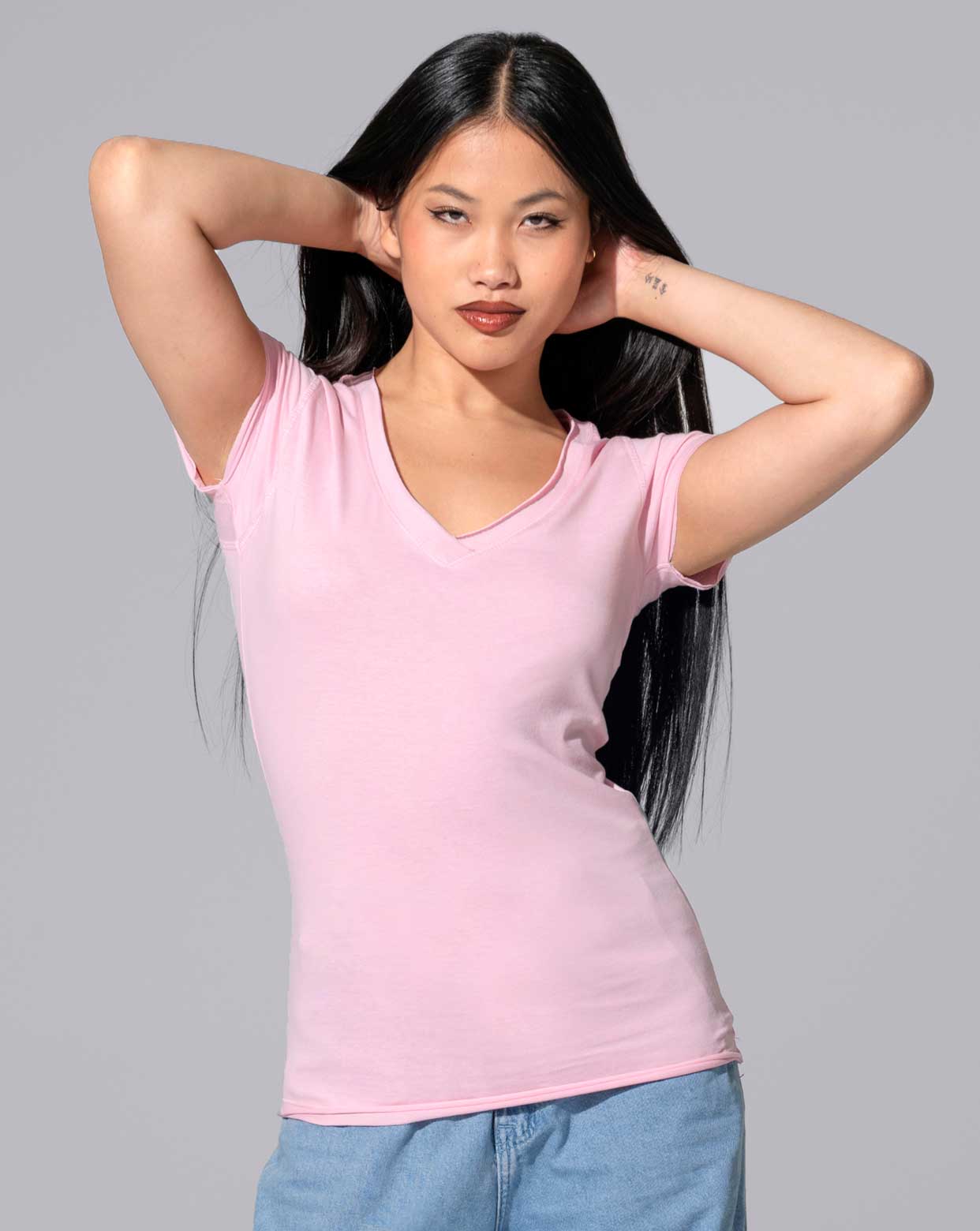 Camiseta de chica con cuello de pico, 100% algodón, con los bordes del cuello, mangas y bajo sin rematar. Disponible en 15 colores y desde la talla S hasta la XL. Etiqueta removible.&…