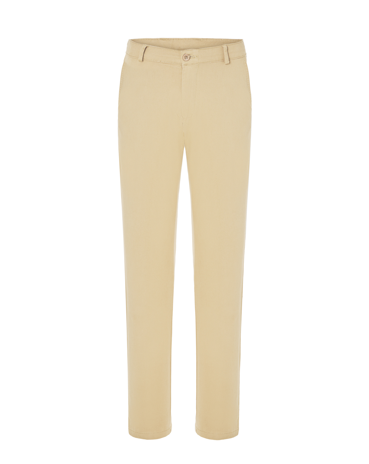 Pantalón chino de hombre. Cierre de cintura con botón con logo de JHK, seis trabillas y cremallera a juego con el color. Dos bolsillos en la espalda y en el delantero.