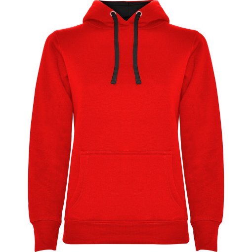 Sudadera entallada de corte femenino con capucha bicolor de doble tejido, con cordón contrastado ajustable, cubrecosturas en el cuello y bolsillo canguro. Punto canalé con elastano 1×1 en puños y cintura. Detalle thumb slit – puños con apertura para el pulgar.