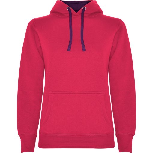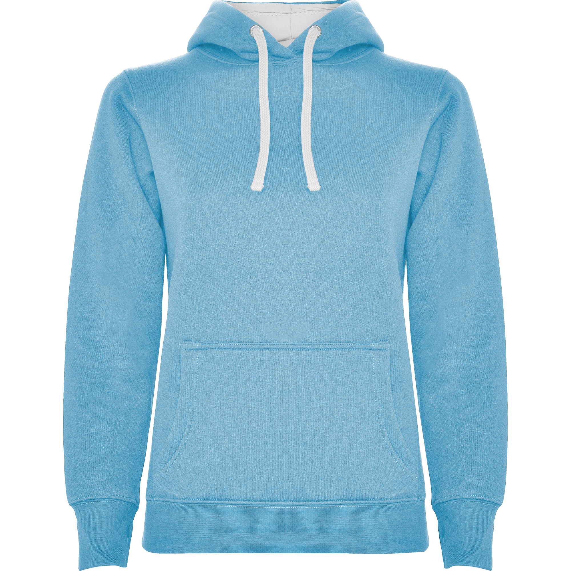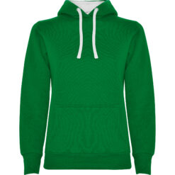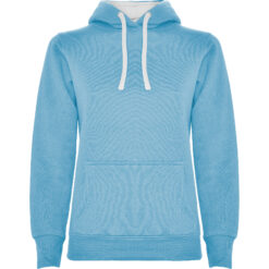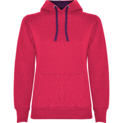 Sudadera entallada de corte femenino con capucha bicolor de doble tejido, con cordón contrastado ajustable, cubrecosturas en el cuello y bolsillo canguro. Punto canalé con elastano 1×1 en puños y cintura. Detalle thumb slit – puños con apertura para el pulgar.