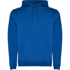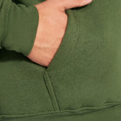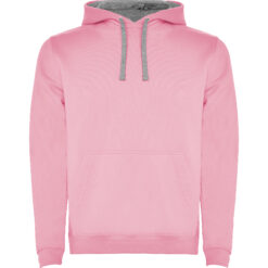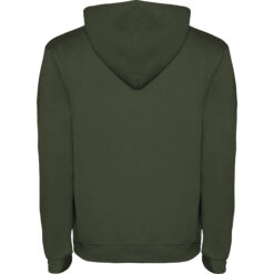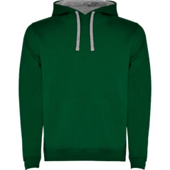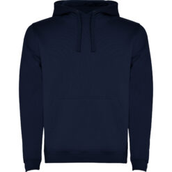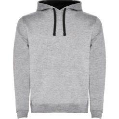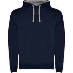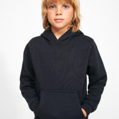 Sudadera con capucha de doble tejido, con cordón ajustable, en acabados solido y bicolor. Cubrecosturas en el cuello y bolsillo canguro. Punto canalé con elastano 1×1 en puños y cintura. Modelo de niño sin cordón.