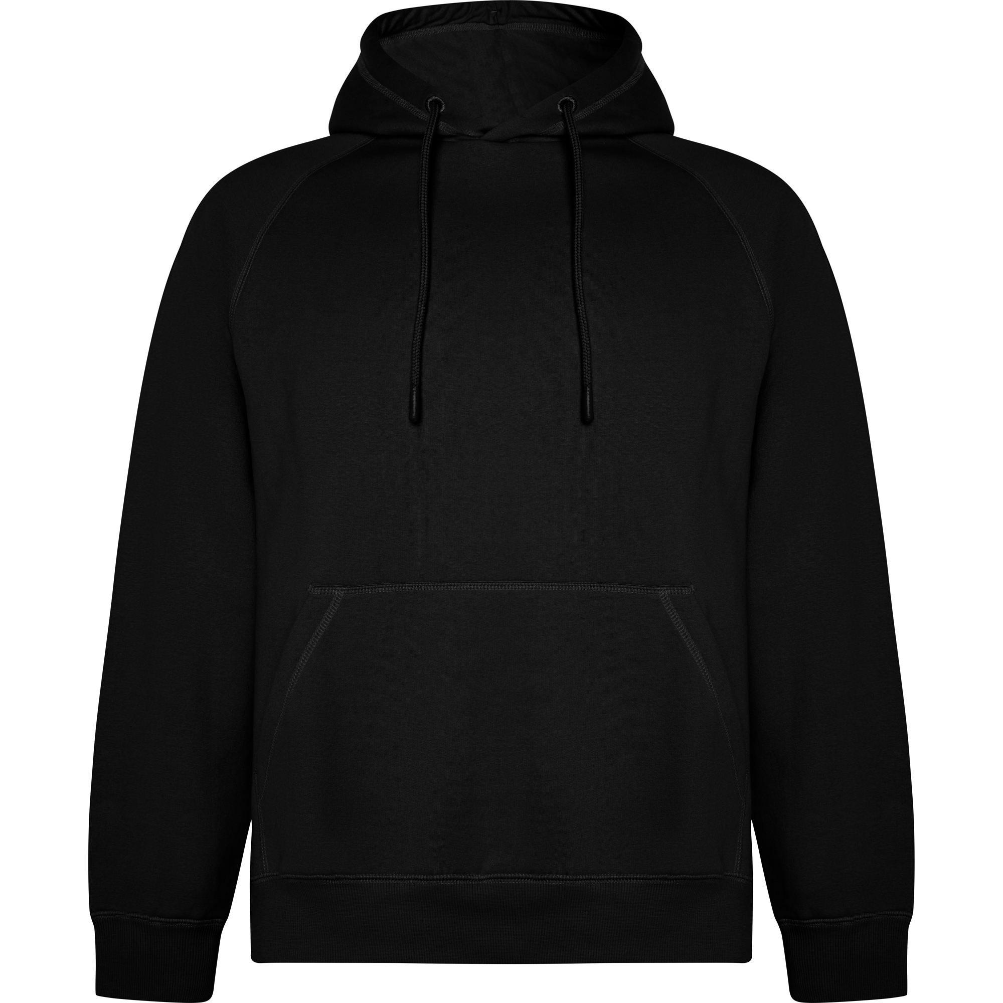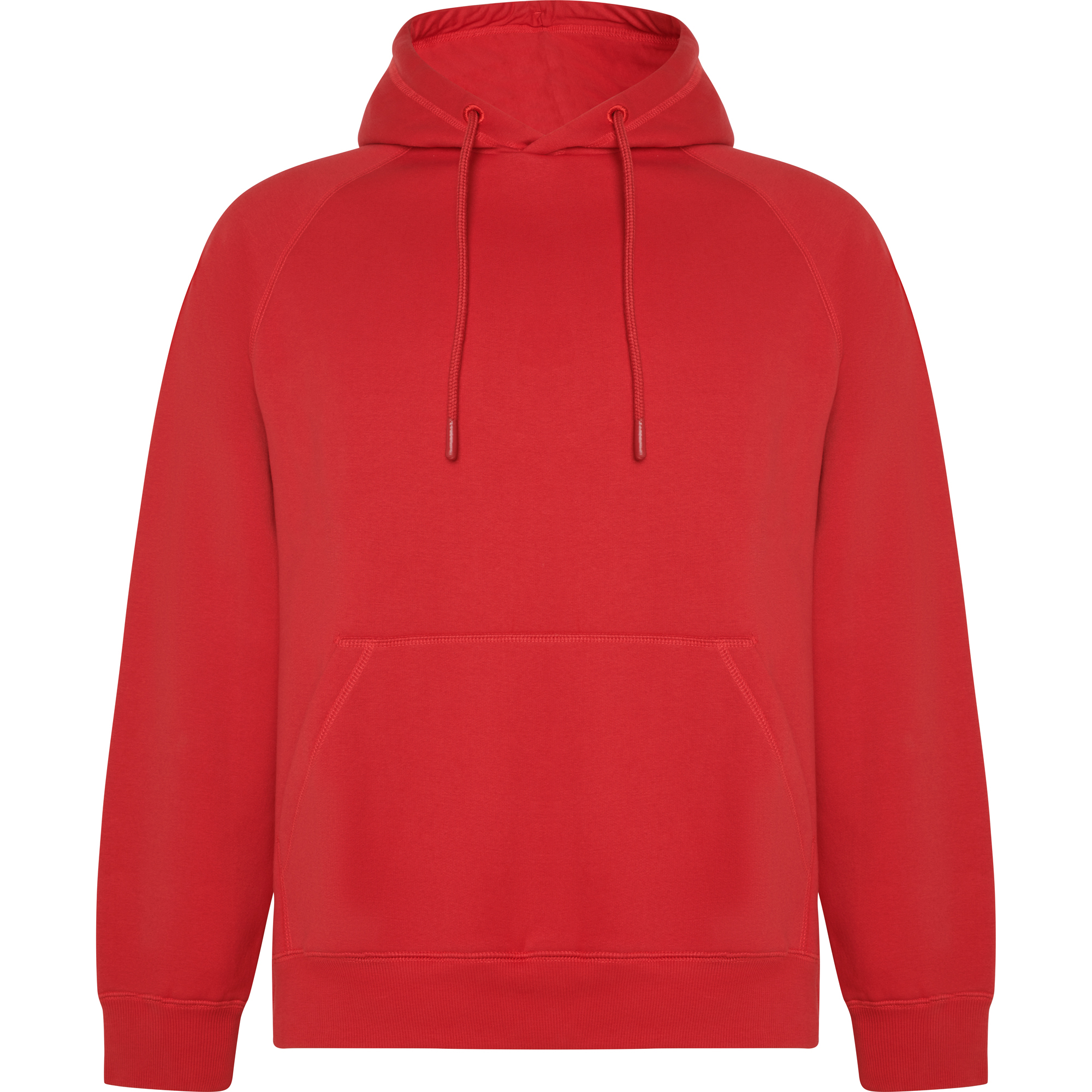 Sudadera con capucha Unisex en Algodón Orgánico Peinado y Poliéster Reciclado. Bolsillo Canguro. Capucha forrada de punto liso y cordones redondos ajustables , ojales bordados. cuello puños y cinturilla de punto canalé 2×1.
