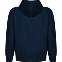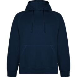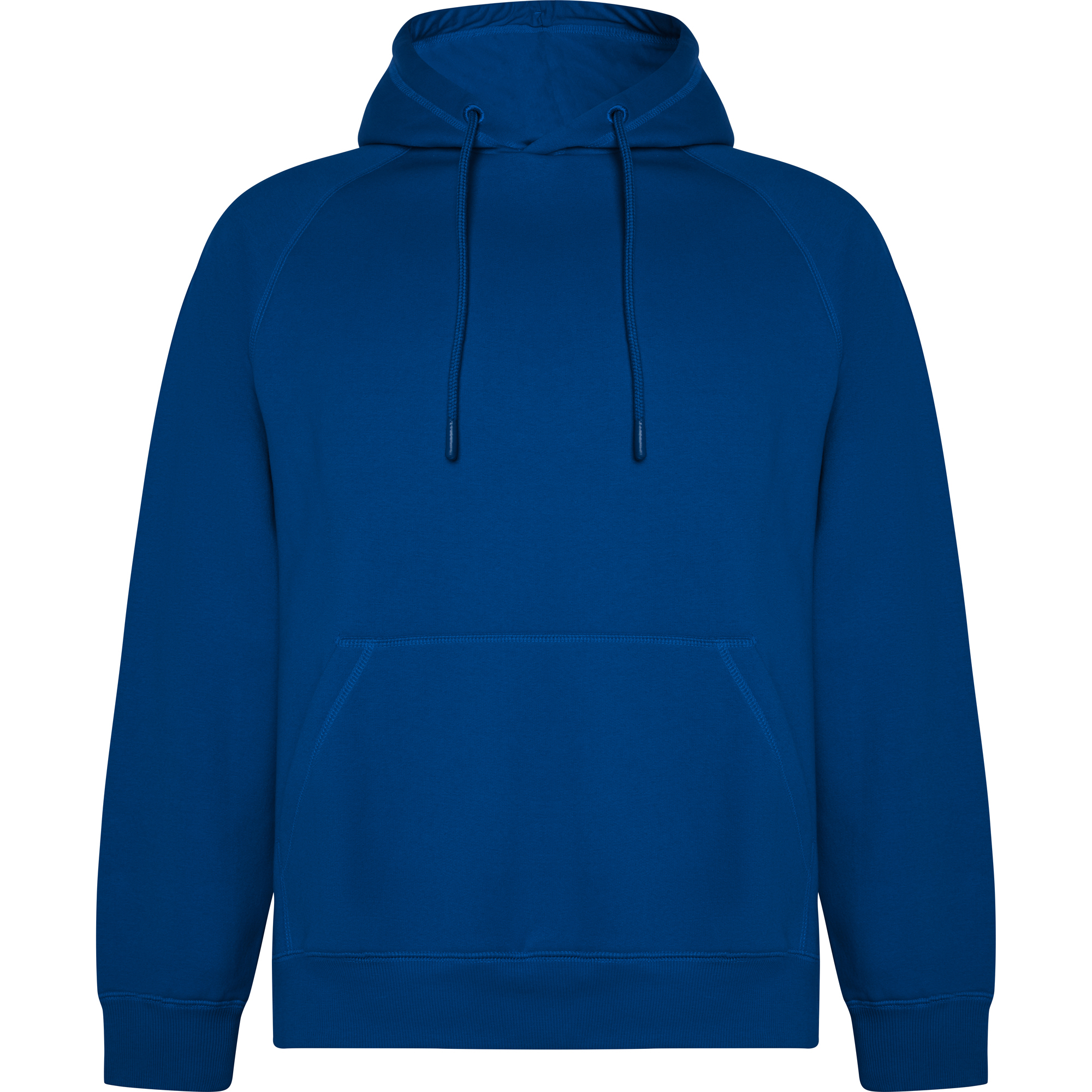 Sudadera con capucha Unisex en Algodón Orgánico Peinado y Poliéster Reciclado. Bolsillo Canguro. Capucha forrada de punto liso y cordones redondos ajustables , ojales bordados. cuello puños y cinturilla de punto canalé 2×1.