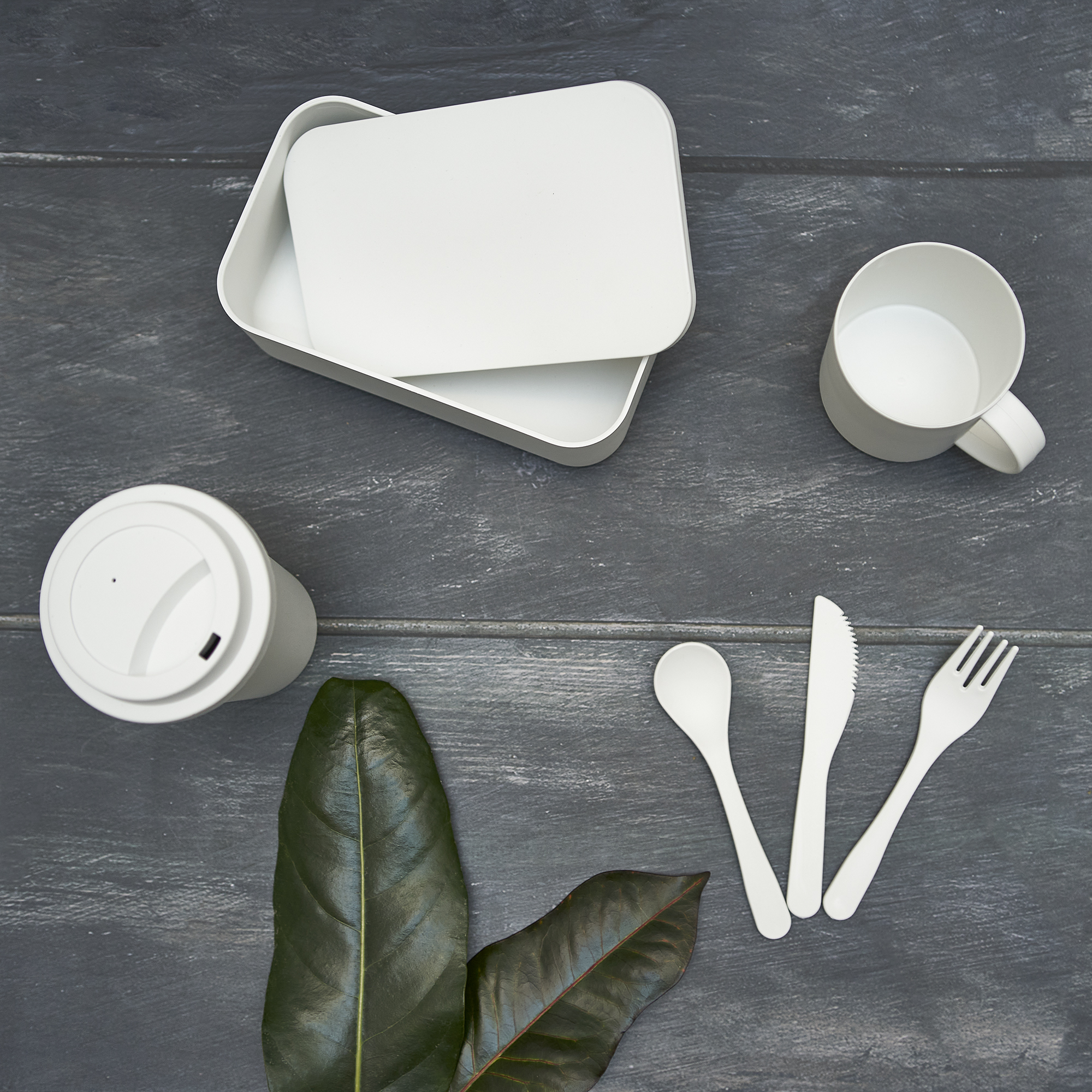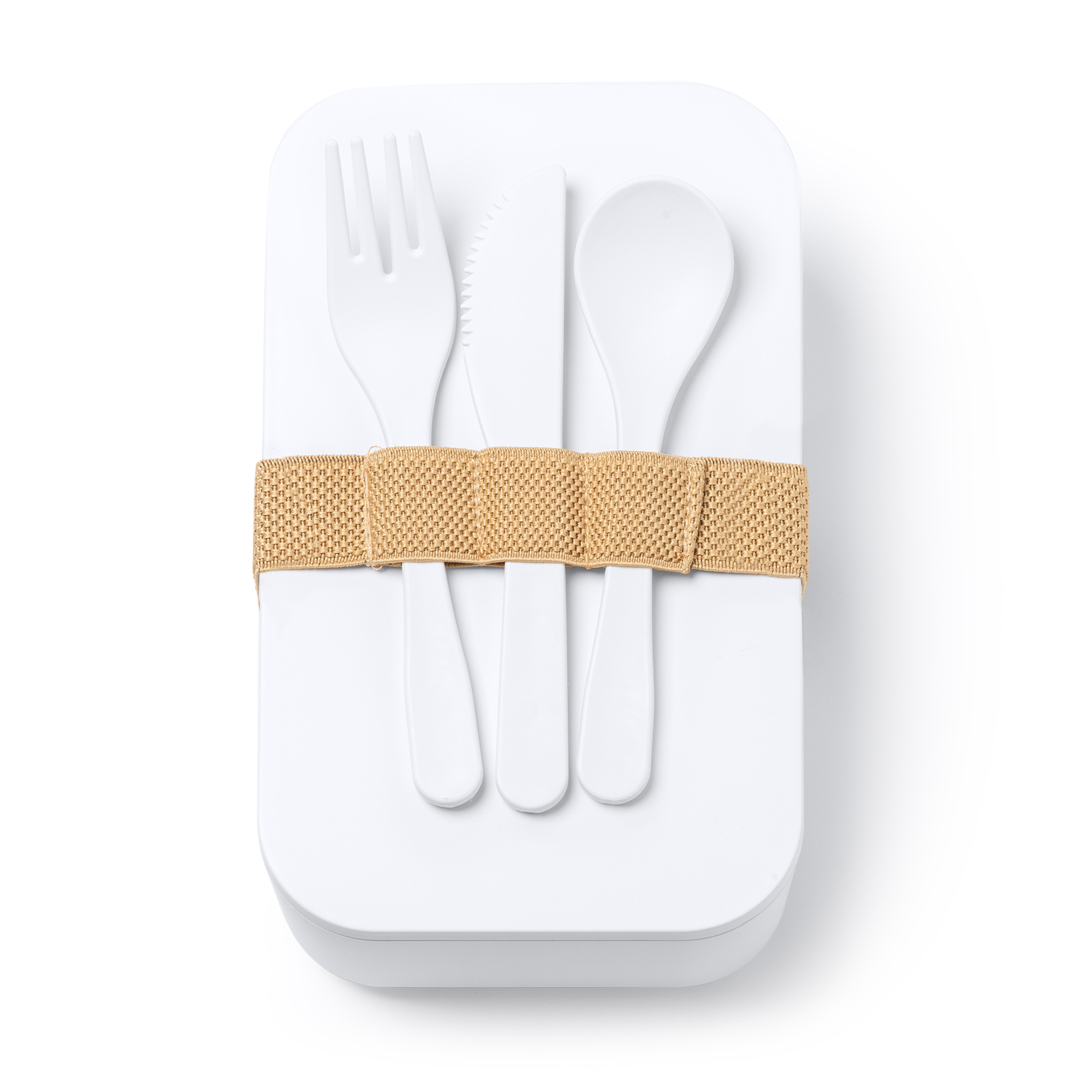 Fiambrera realizada en PLA con cinta de ajuste en silicona. Incluye Tenedor, cuchara y cuchillo. Capacidad 1 L. Disfruta de la comida en cualquier lugar.