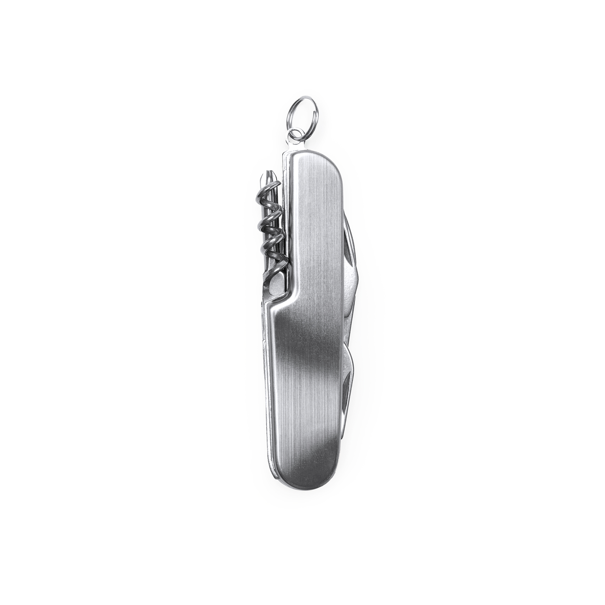 Navaja multiusos de acero inoxidable con 6 funciones: cuchillo, abridor, abrelatas, descorchador, destornillador y llavero.